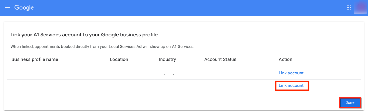 After confirming business information, a new browser tab opens where you link your Local Services Ads account. Only one account should be linked during this process.