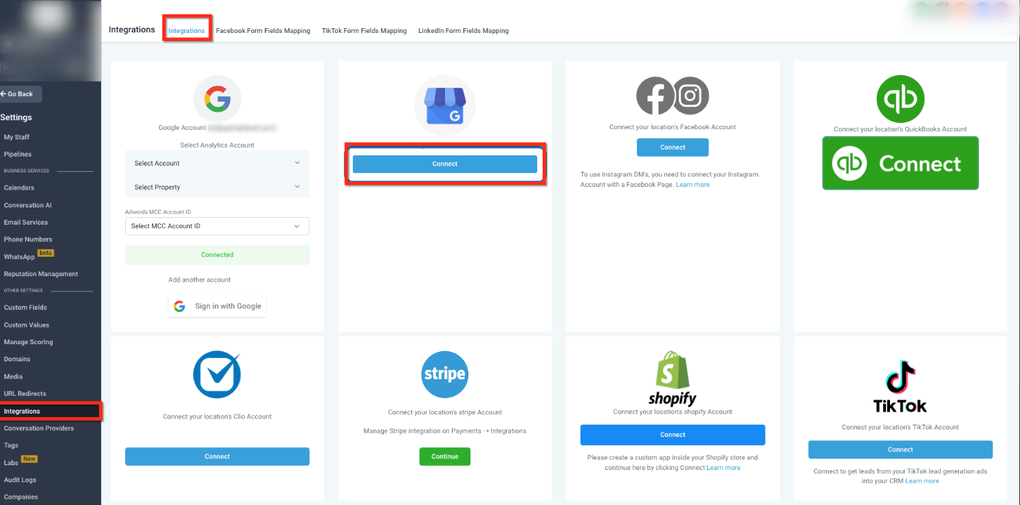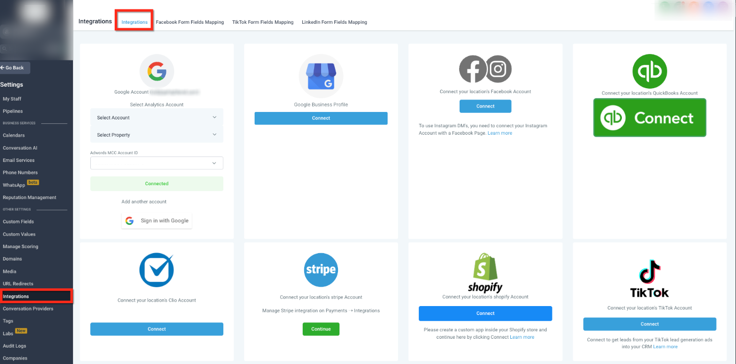 To begin, navigate to the integrations section inside your account settings. This is where all external services and page connections are initiated and maintained.