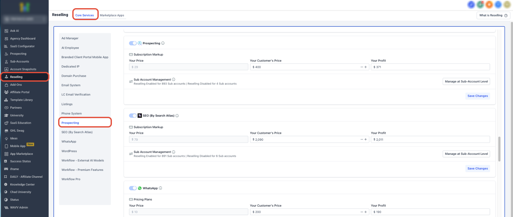 Within the main navigation, open the Reselling section and locate Prospecting under the available services.