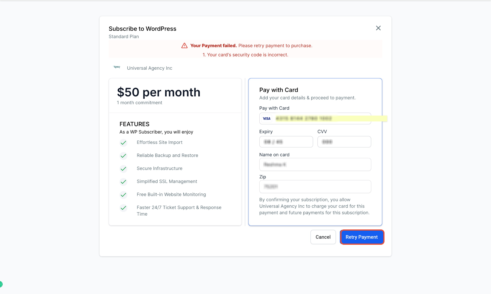 If the failure occurred due to incorrect or outdated card information, you should update your payment details before retrying.