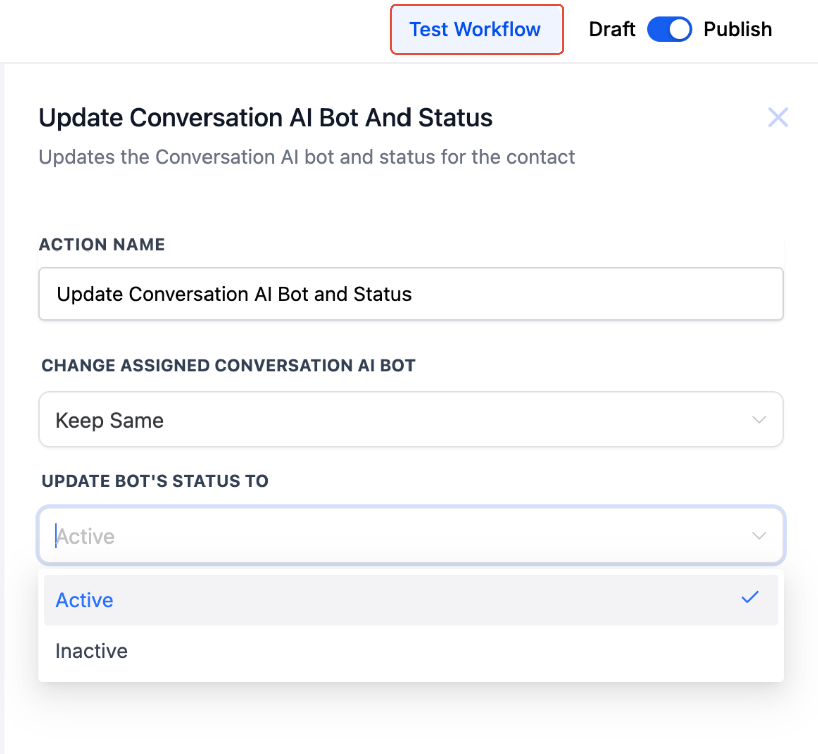 Assigning the right AI bot to the right contact ensures conversations stay relevant and aligned with your business goals. This action allows you to dynamically control which bot interacts with a contact and whether that bot is active or inactive.