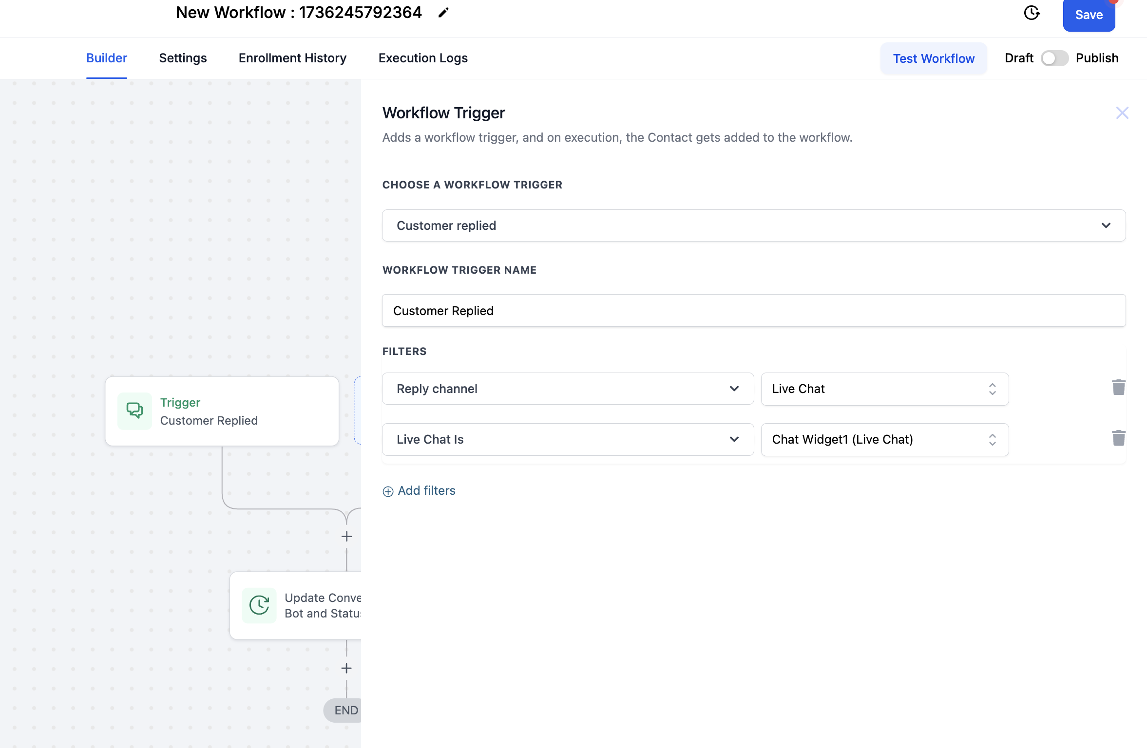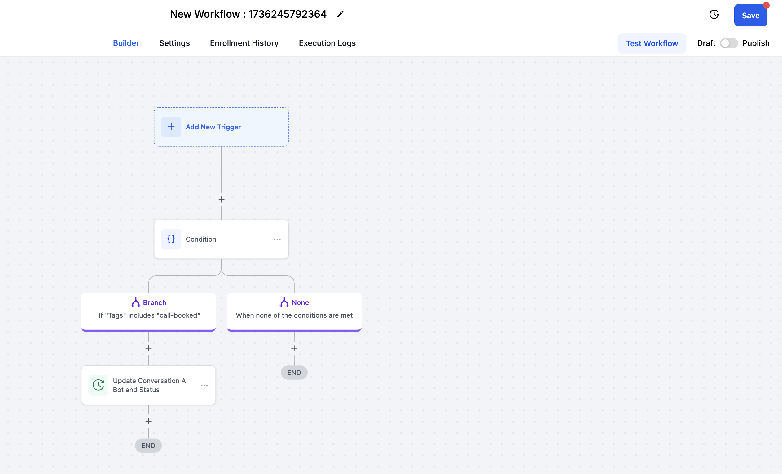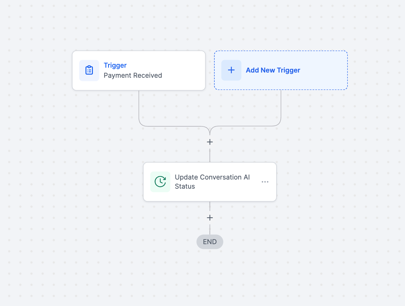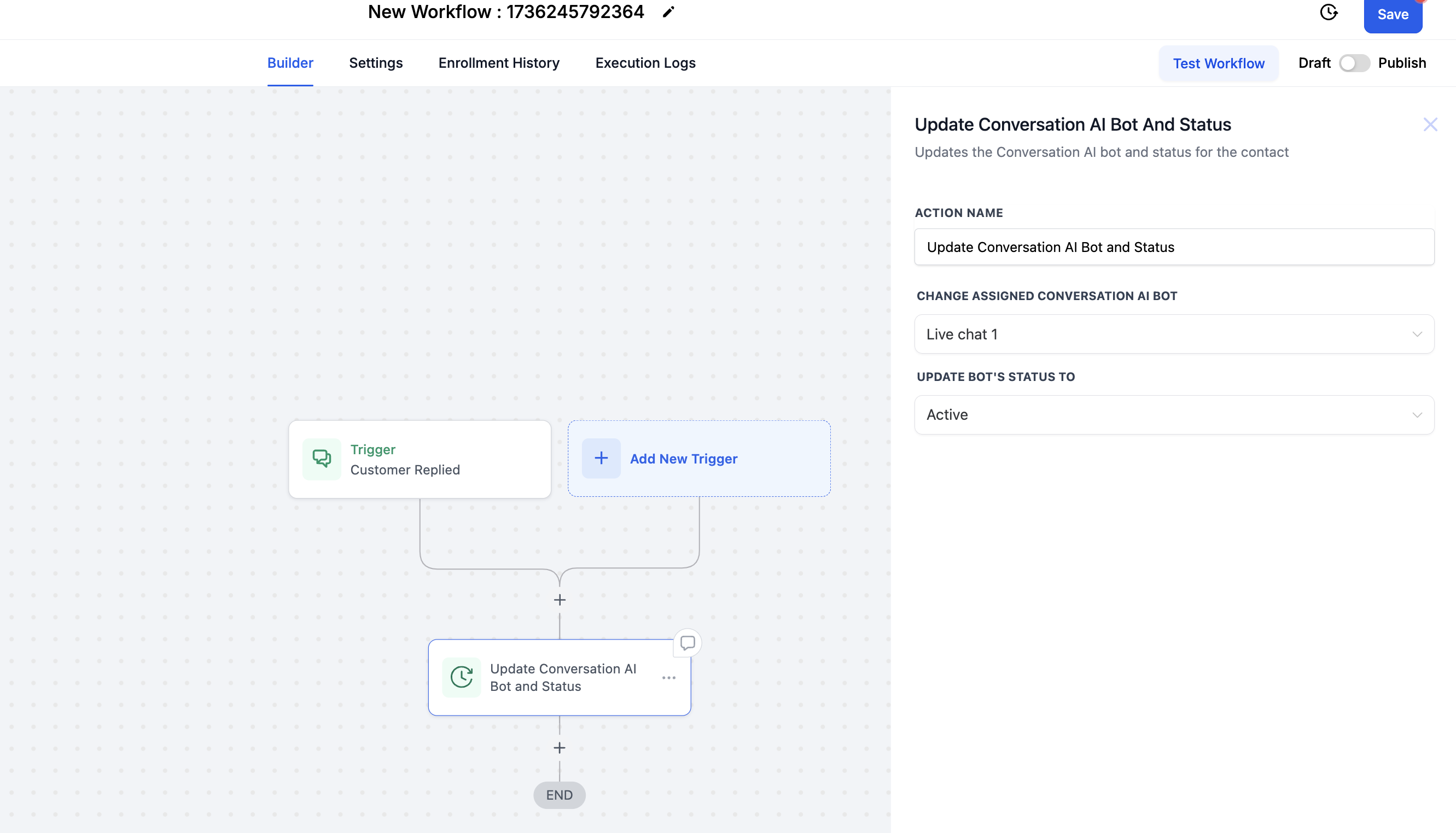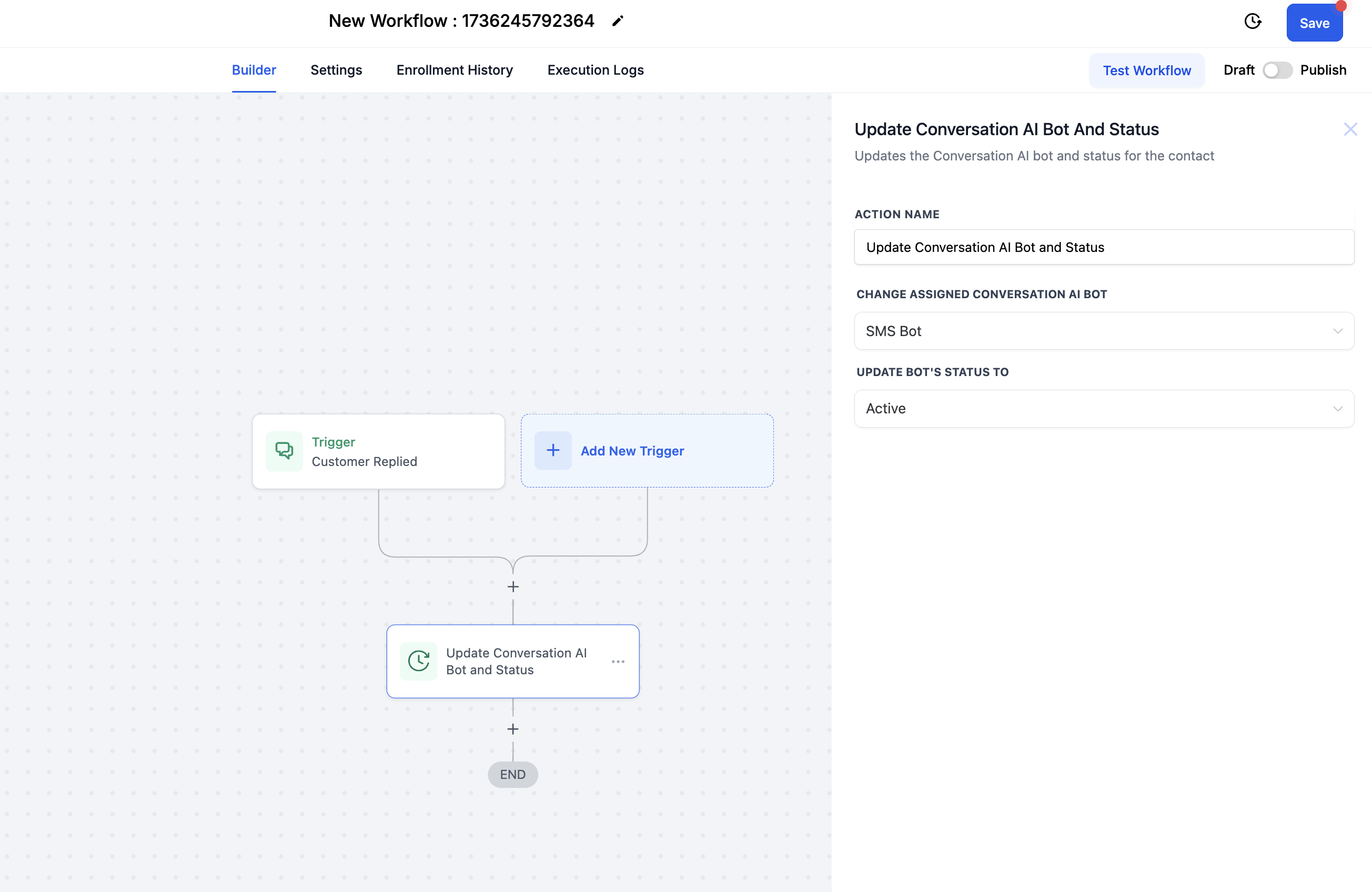The Update Conversation AI Bot and Status action works inside workflows to automatically assign bots and manage their availability. This enables personalized communication based on events such as replies, tags, or payments.