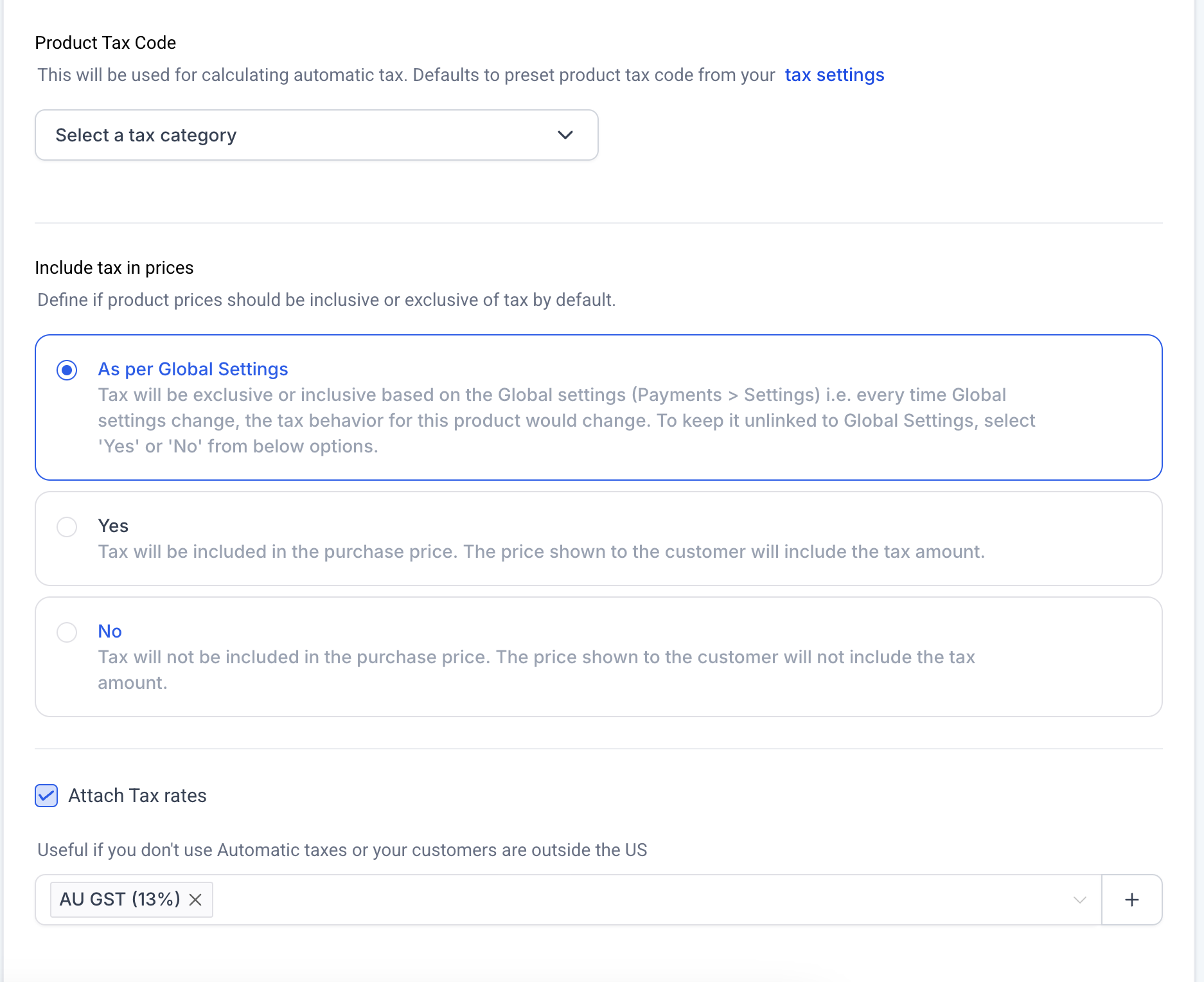 Manual tax rates can be attached to the product if required.