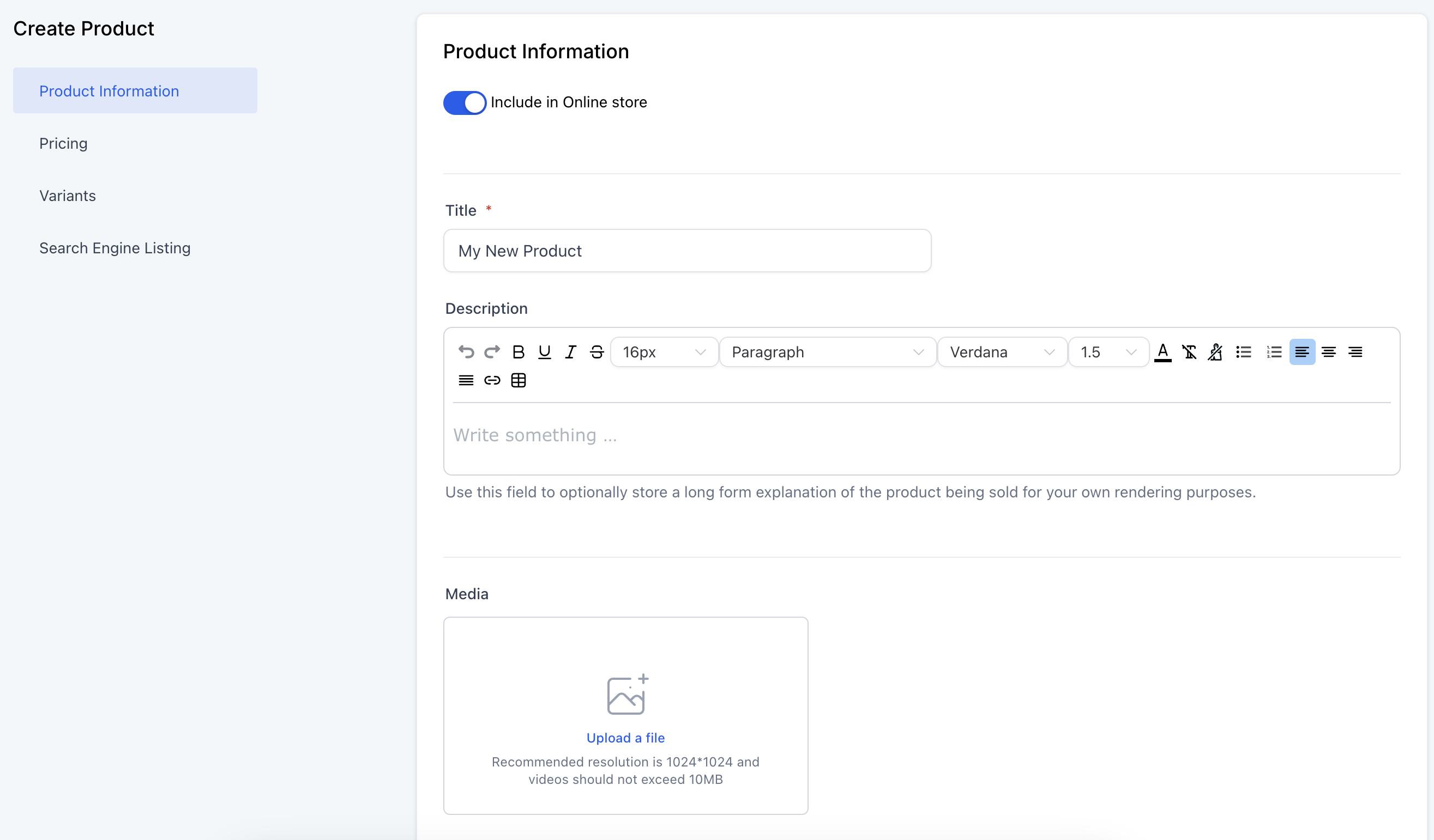 Add detailed product information using the formatting editor.