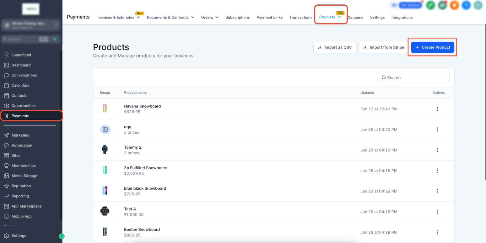 To begin creating a product, navigate to the Products section from the Payments area.