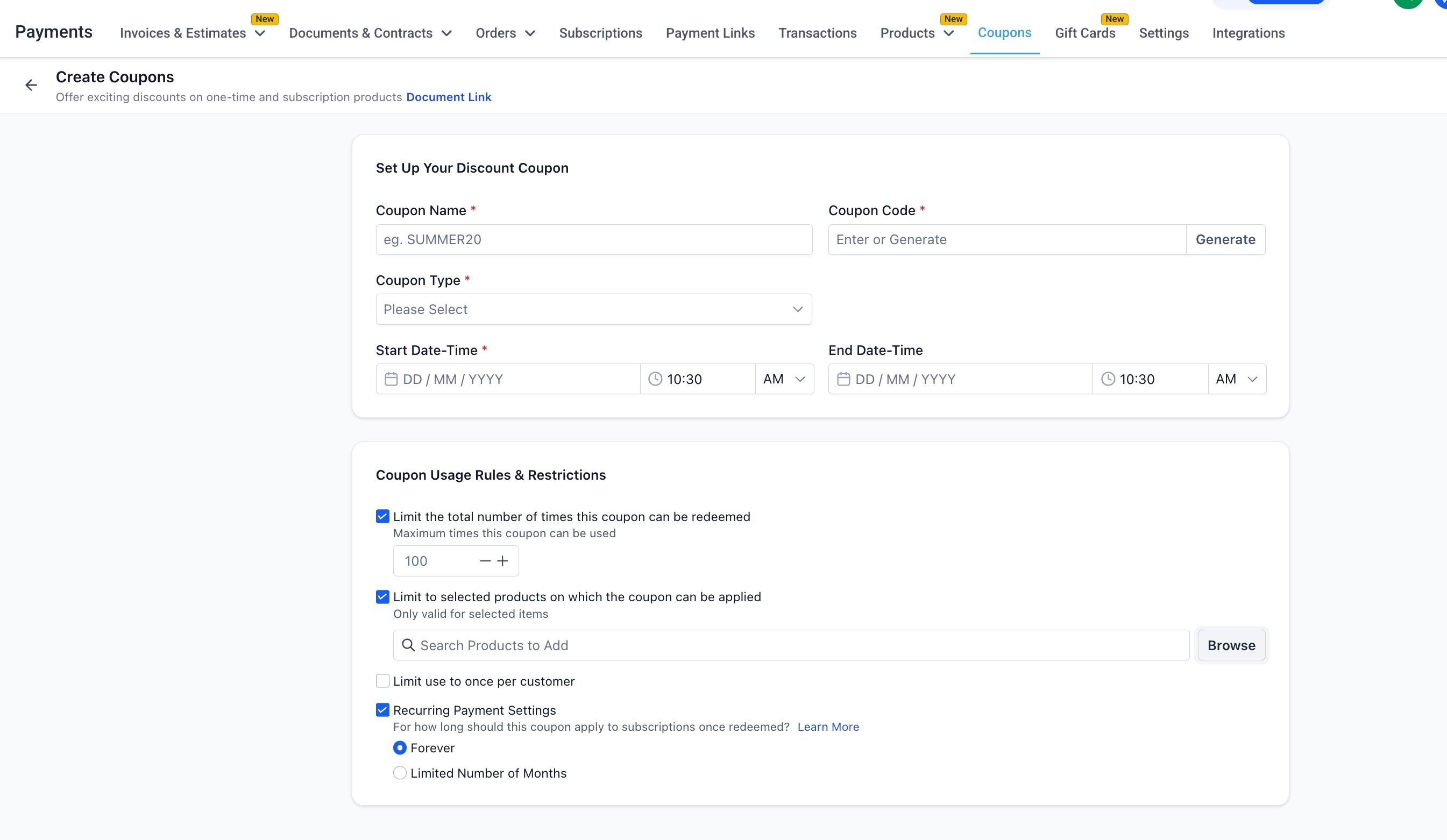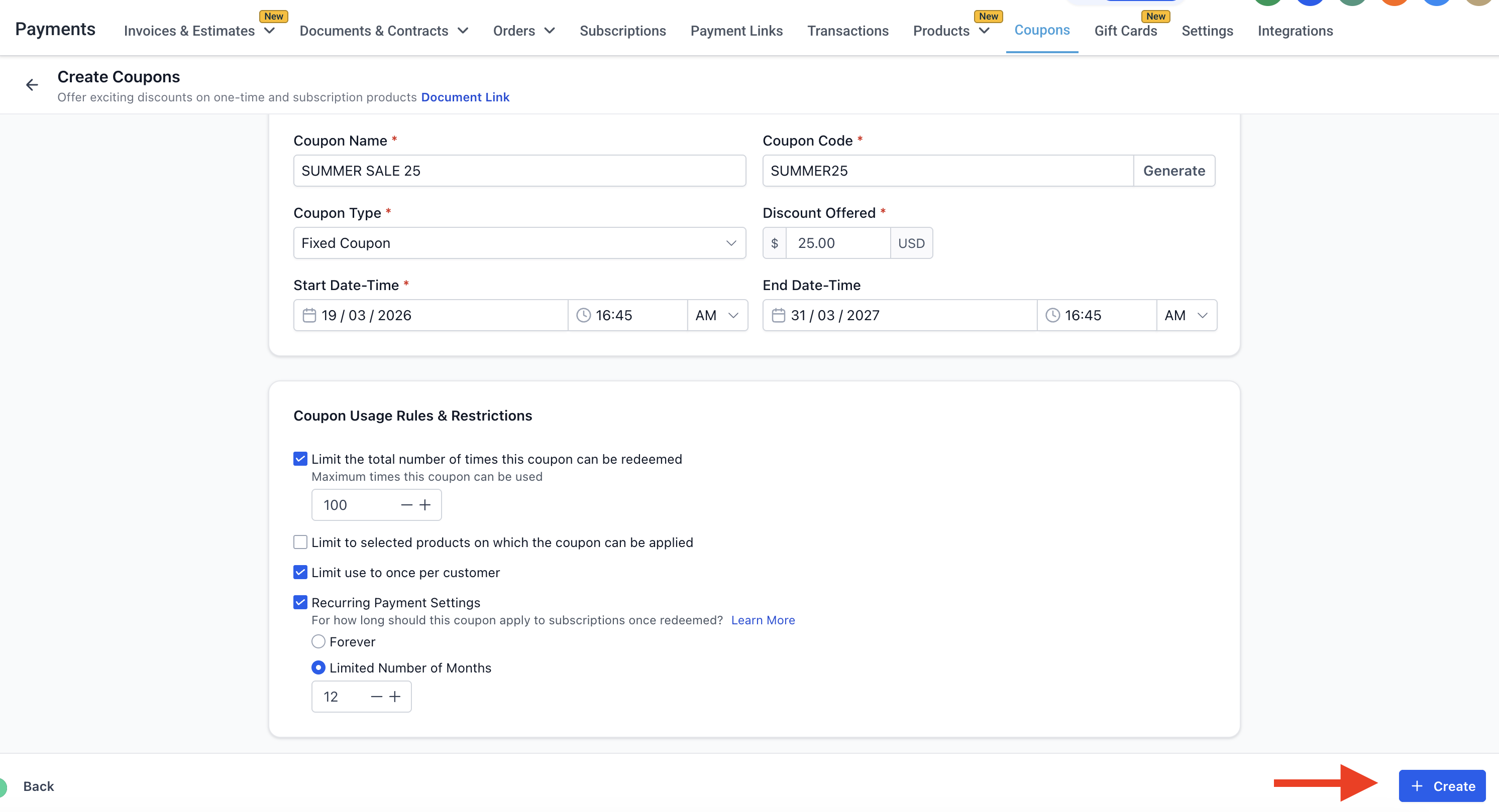 Payments → Coupons → Create Coupon