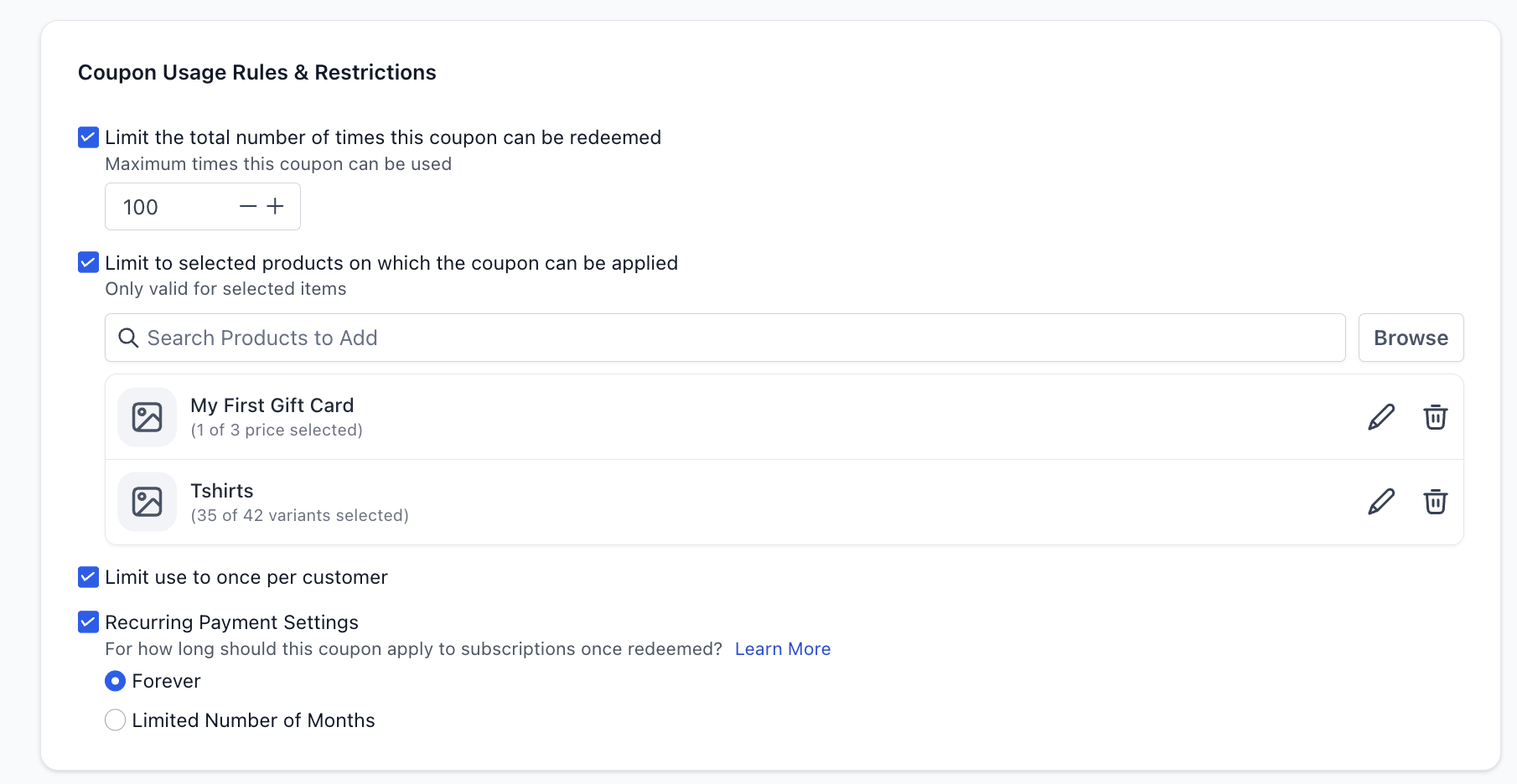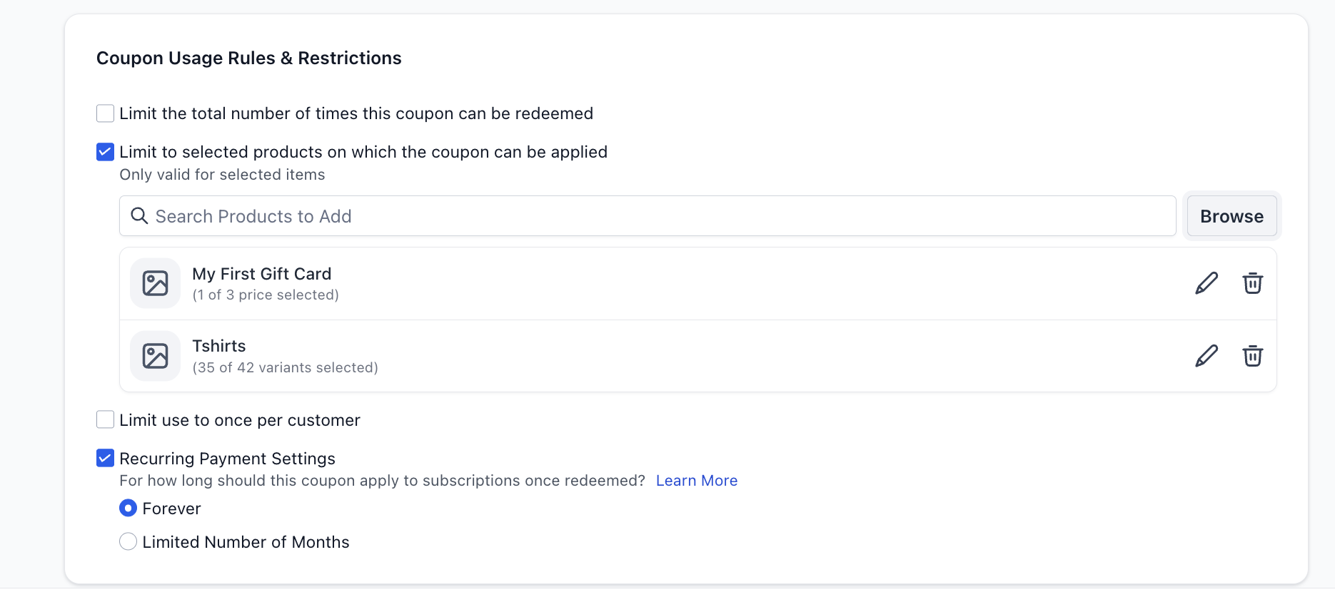 Coupons can also be restricted to certain prices and variants instead of all under a product.