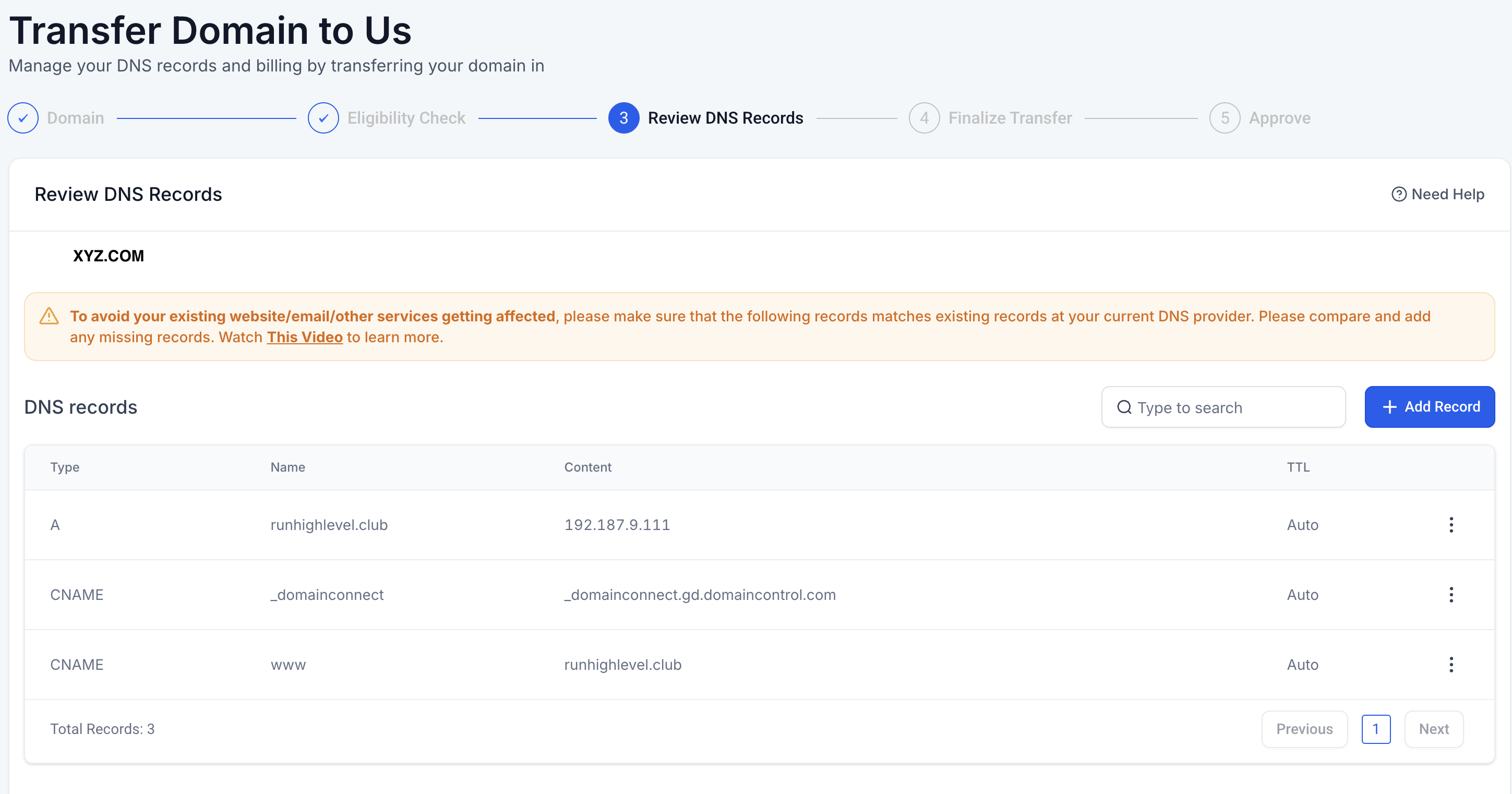 Always manually cross-check the scanned records with your current DNS provider. Auto-scanning might miss some records. You can edit, delete, or add records before finalizing the transfer.
