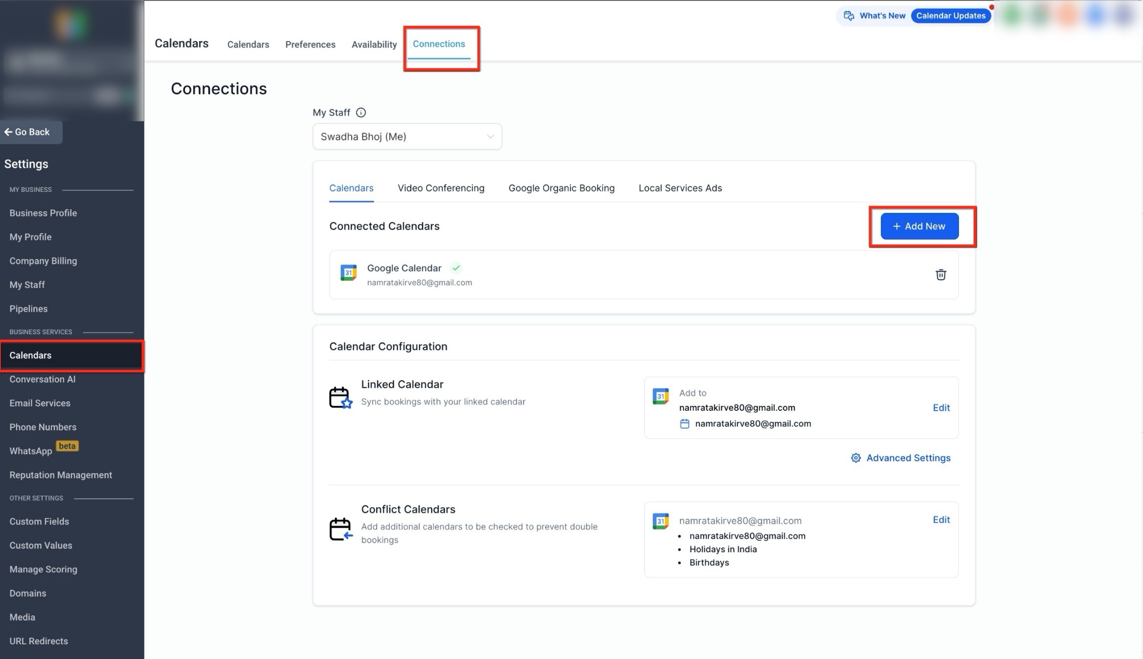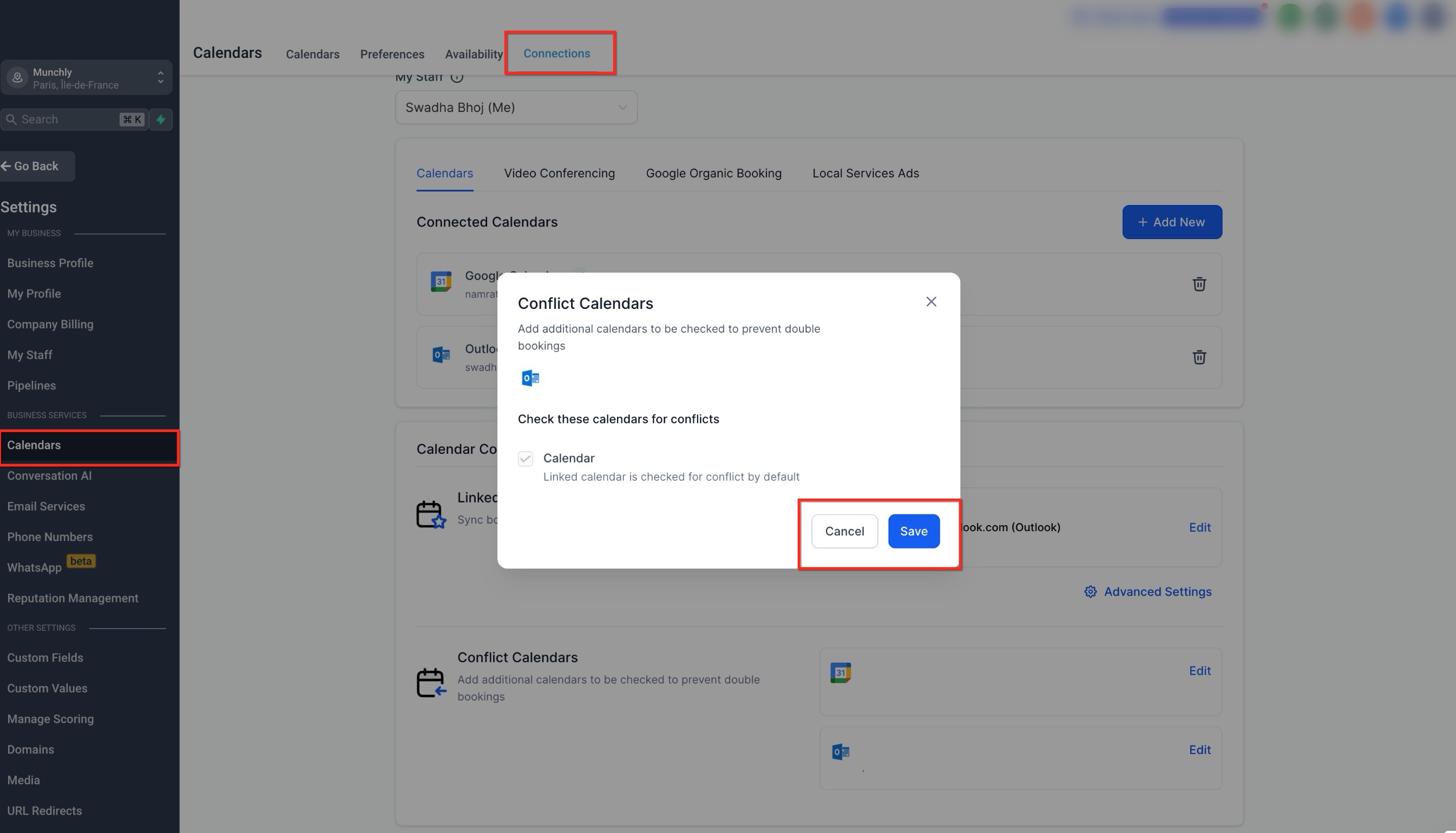 The Conflict Calendar is used to check availability. Events marked as busy block booking times, while events marked as free do not affect availability. Multiple calendars can be added here to ensure schedules remain accurate.