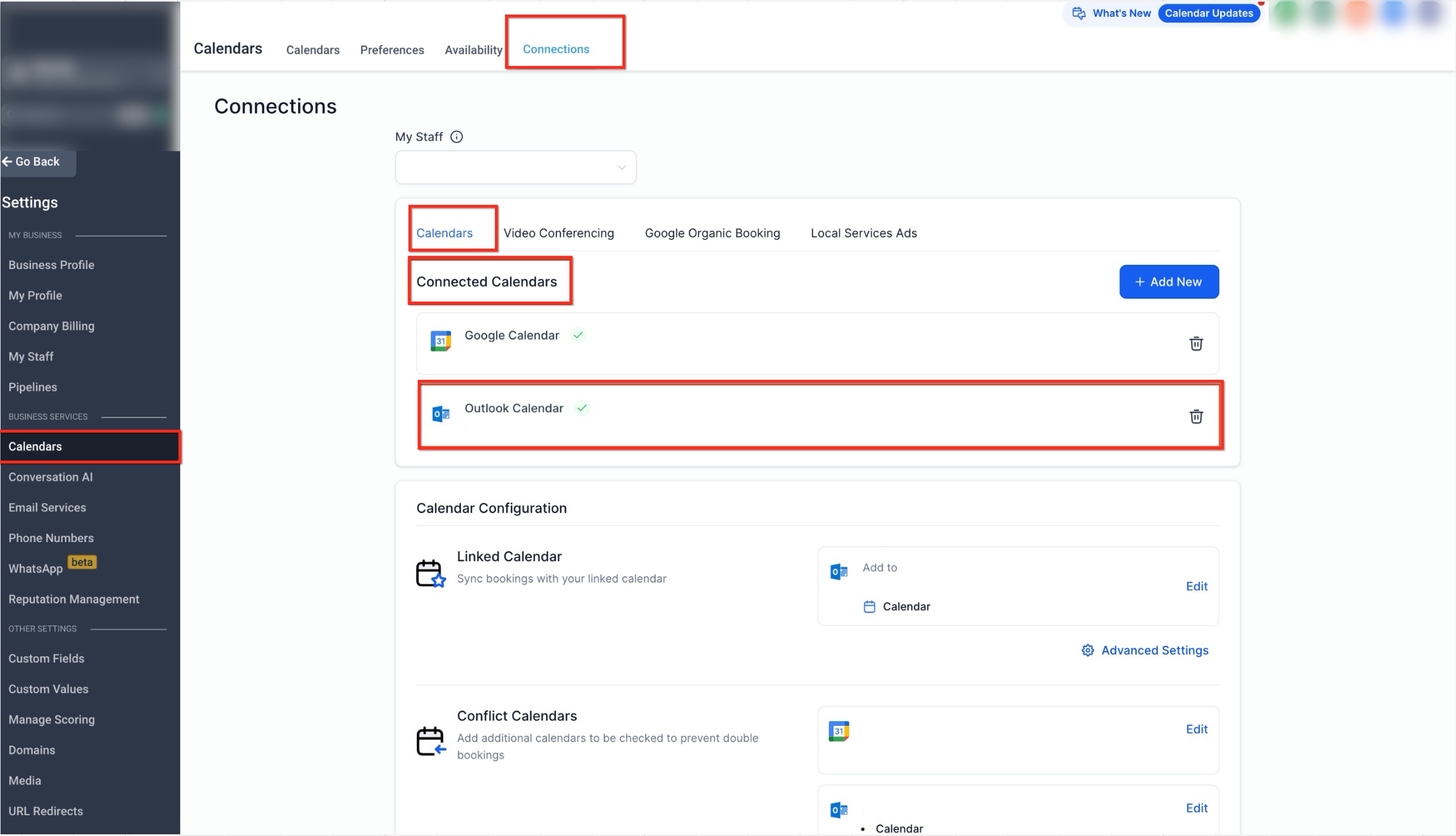 After connecting a calendar, configuration determines how events sync and how availability is calculated. Two settings control this behavior: Linked Calendar and Conflict Calendar.