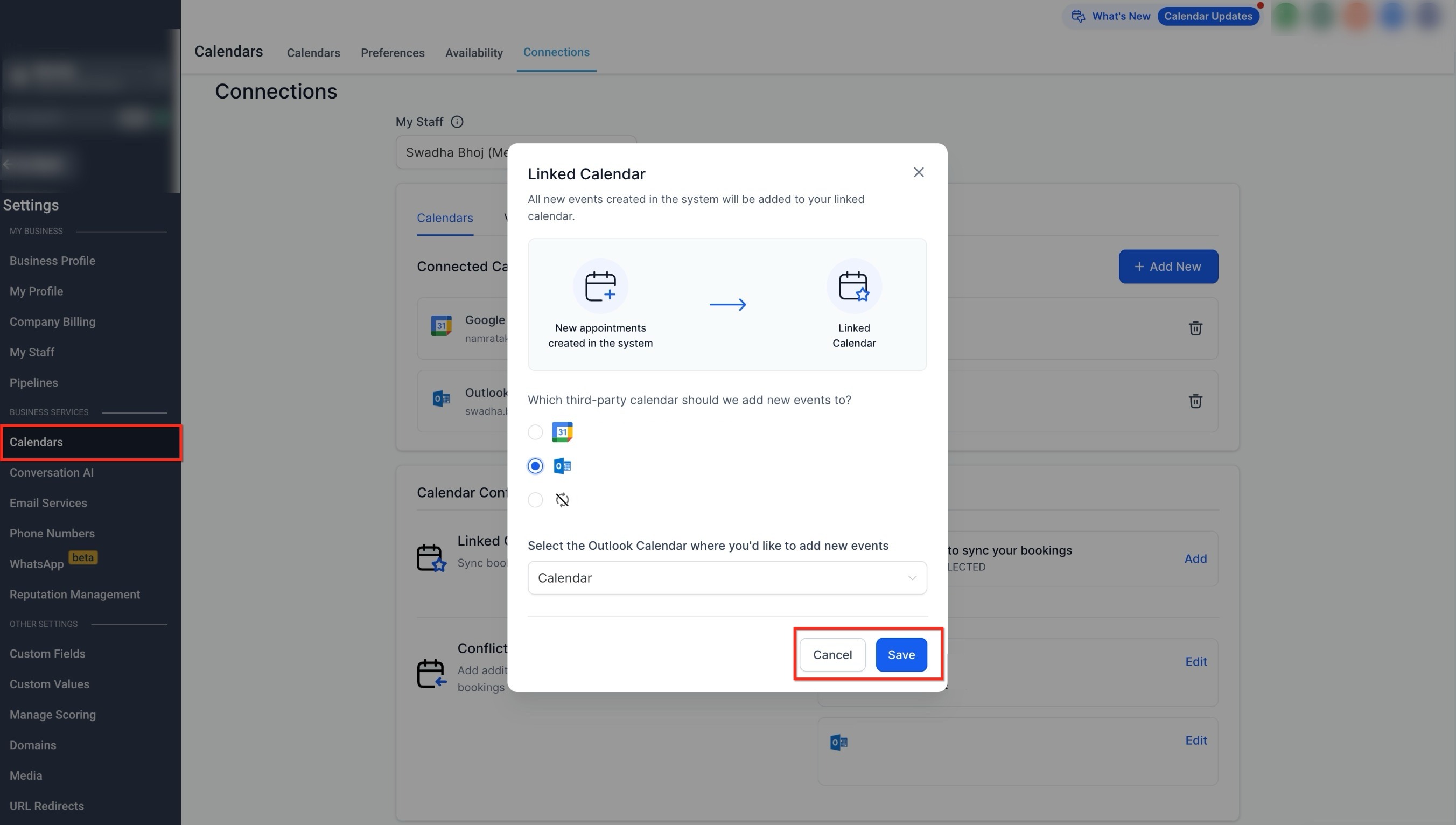 This screen shows how a specific Outlook calendar is chosen to receive new bookings.