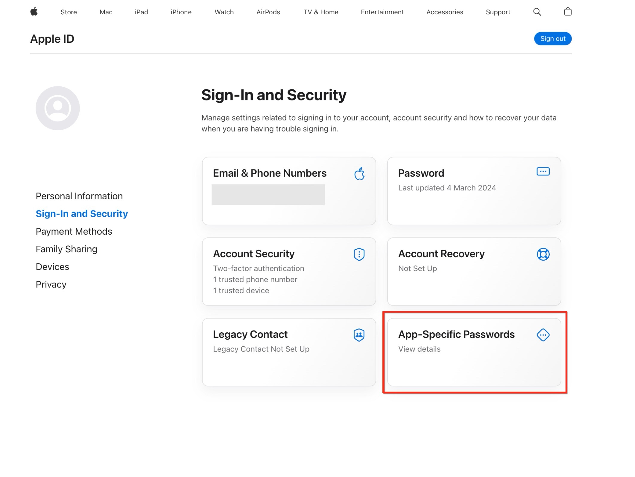 Sign in to your Apple account and open the Sign-In and Security section. From there, locate App-Specific Passwords.