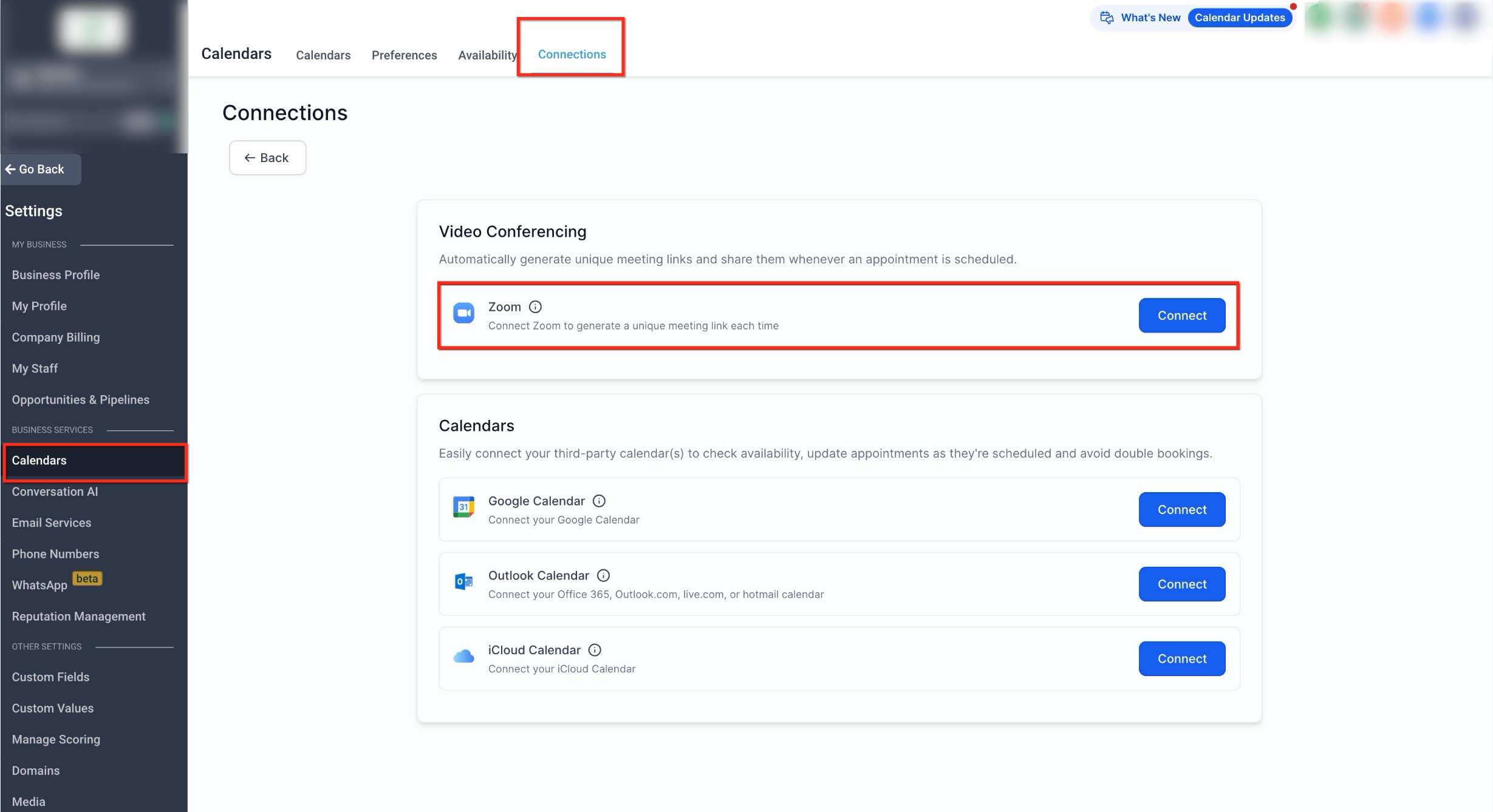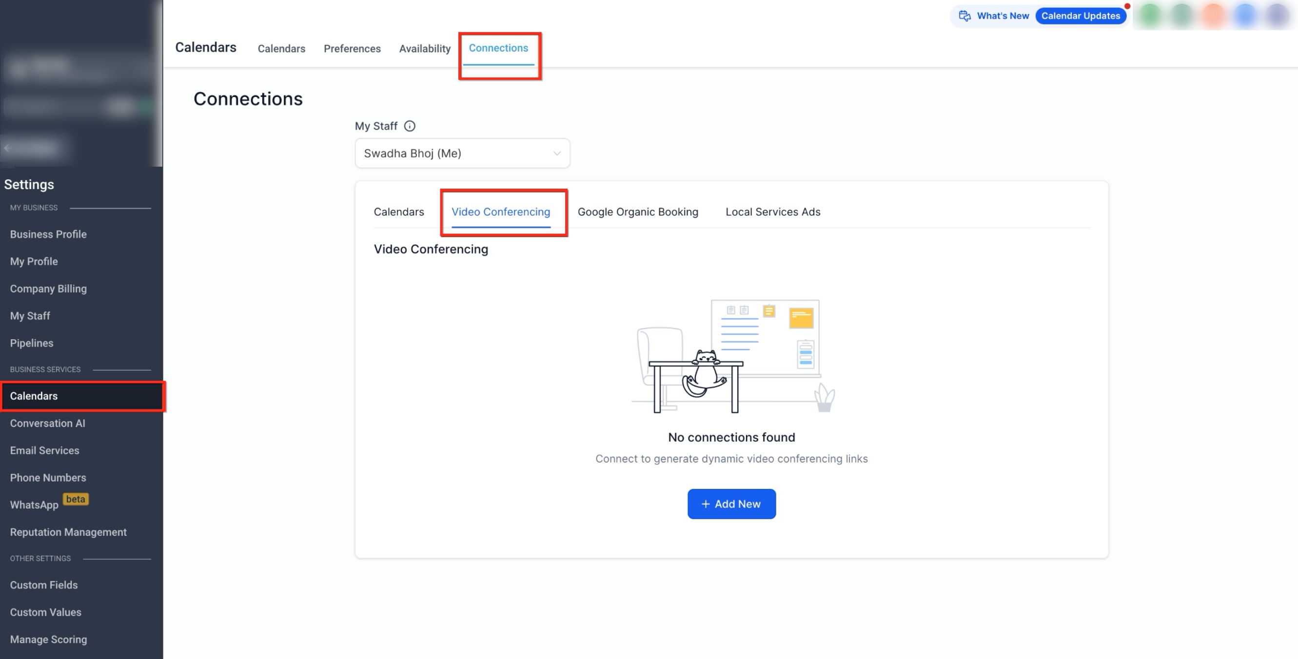 This image shows where video conferencing connections are managed within calendar settings, including the option to add a new connection.