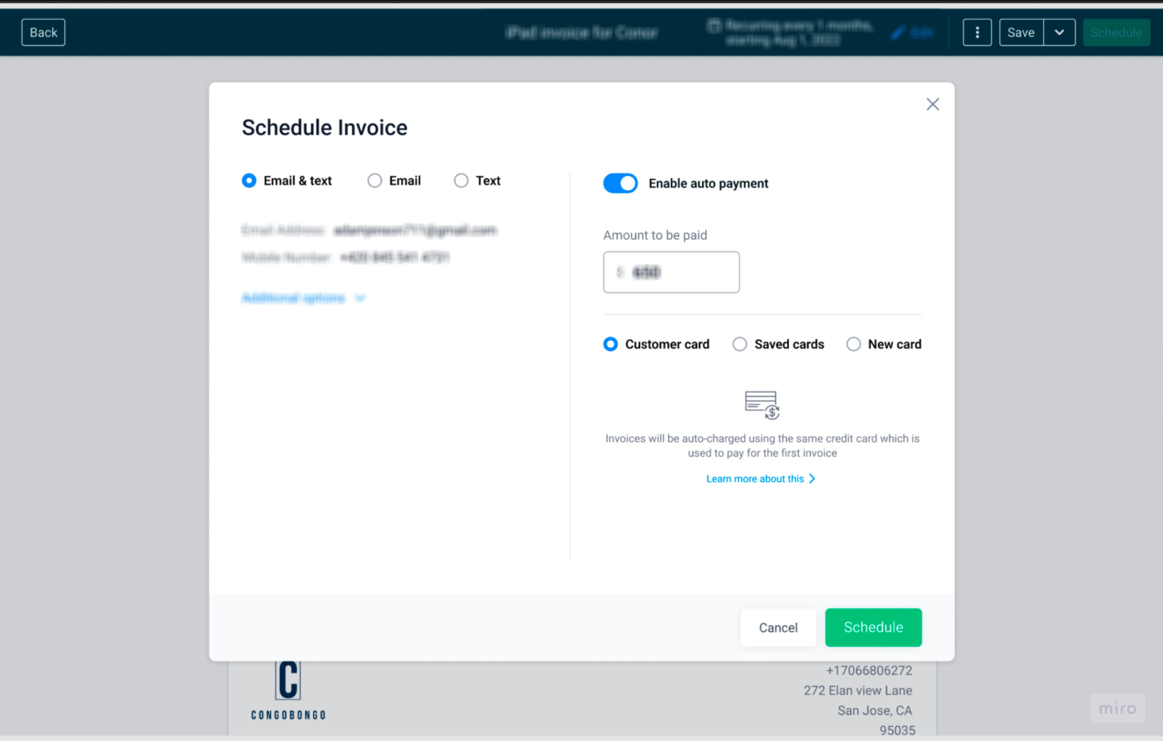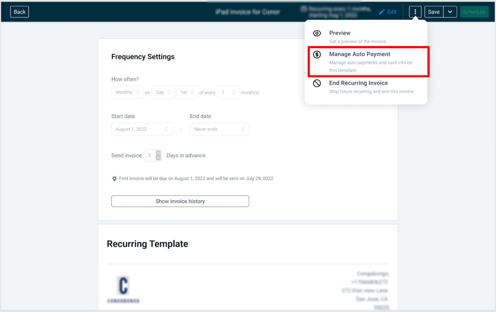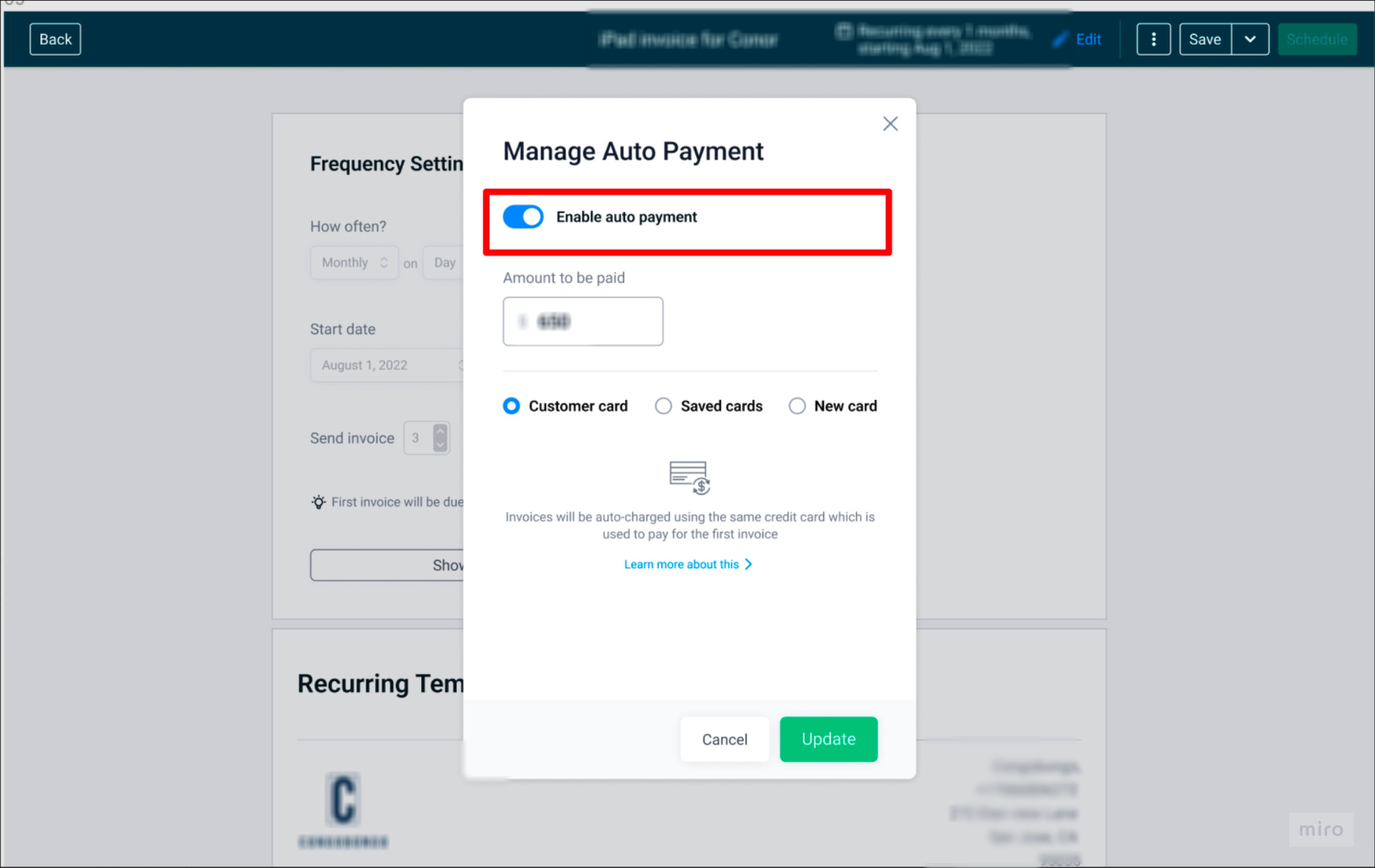 To enable auto payment, open your recurring invoice and schedule it. Turn on the auto payment option, select the payment method, and confirm the amount to be charged. Once enabled, future invoices will be charged automatically.