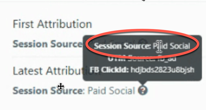 This example shows how attribution details appear when hovering over a source, including session-level tracking data such as identifiers and channel classification.