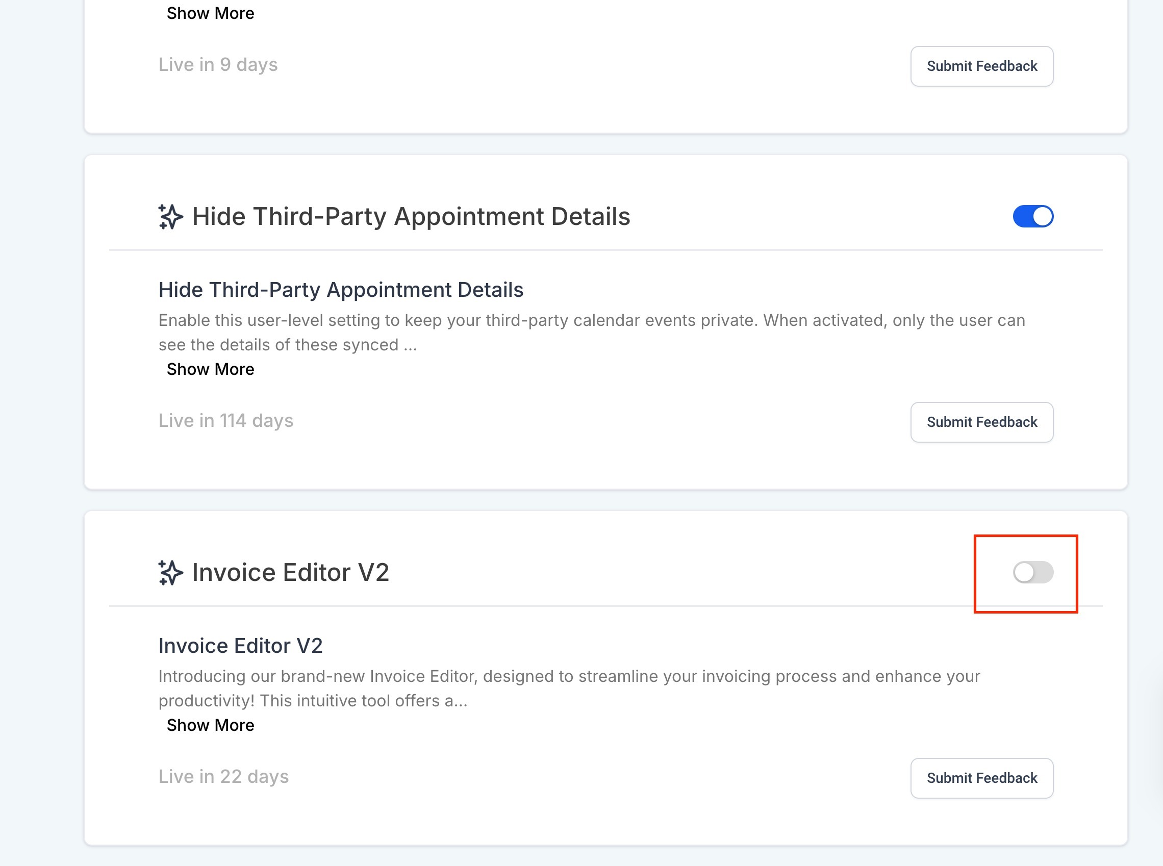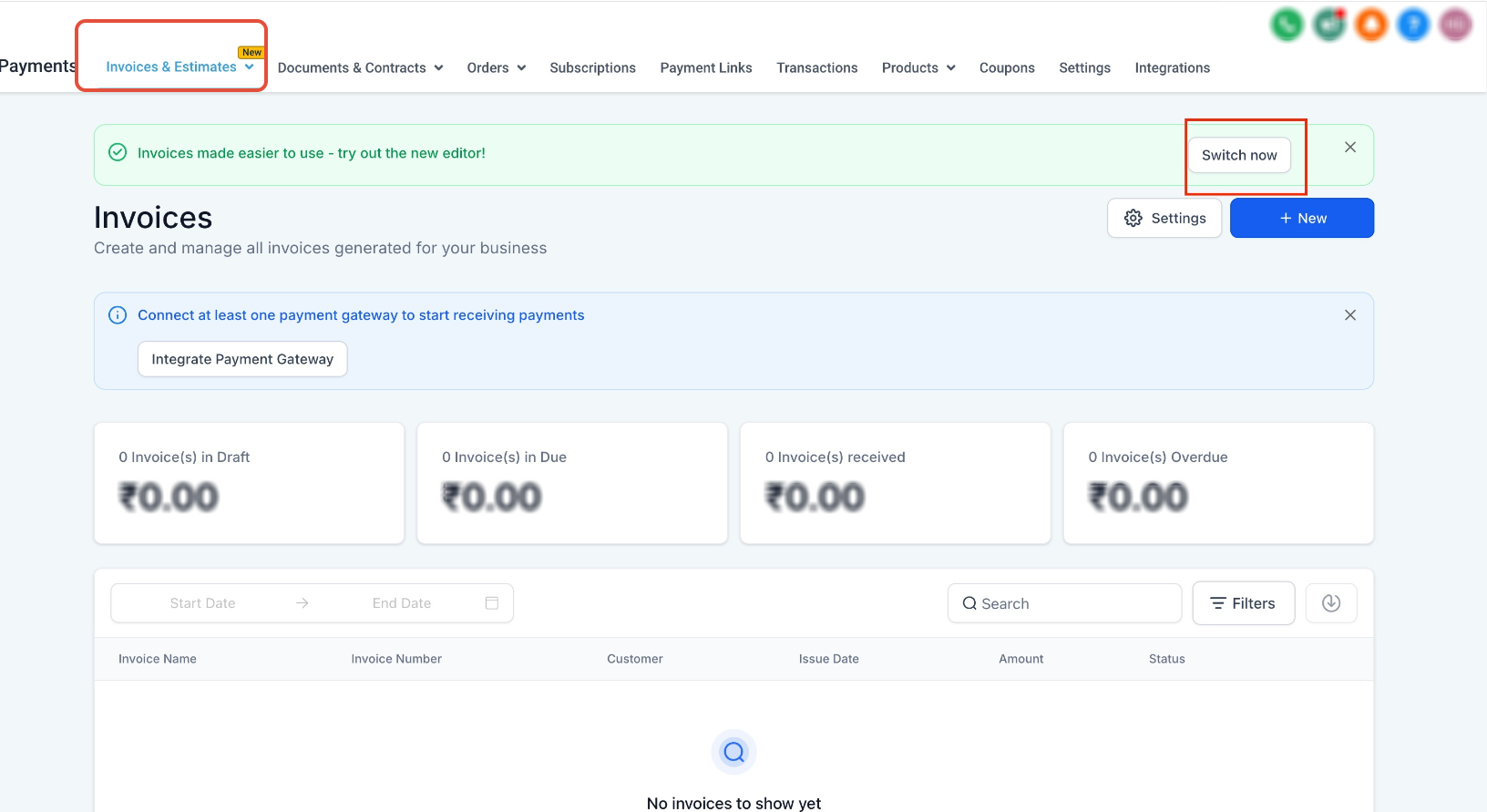 To use the new design, enable it from your settings. Once activated, you will be able to switch to the new invoice experience.