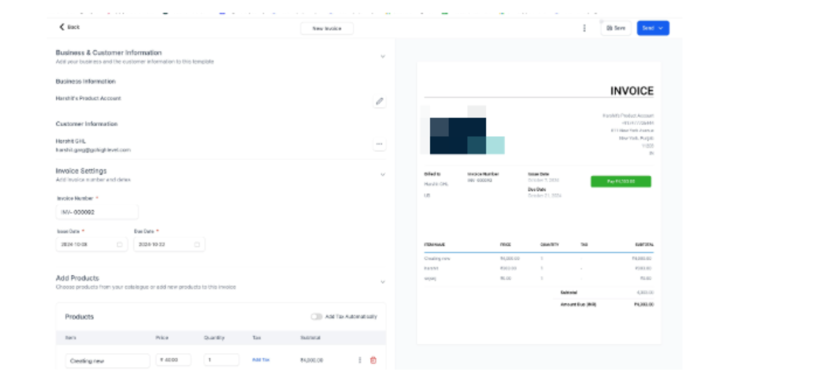 The updated invoice editor introduces a more intuitive layout designed to simplify invoice creation and improve efficiency. With a split-screen experience, you can edit invoice details on one side while previewing the final output instantly on the other. This reduces errors, speeds up the process, and makes sending invoices more seamless.