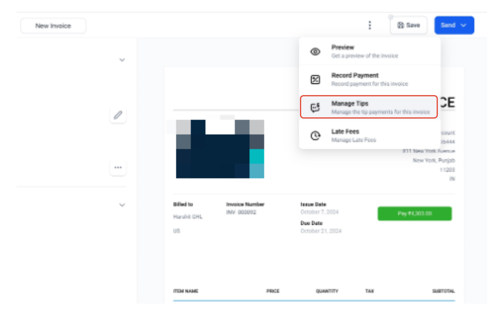 Use the available tools to enhance your invoice, including adding late fees, managing tips, or recording payments. These options remain fully functional in the new editor.