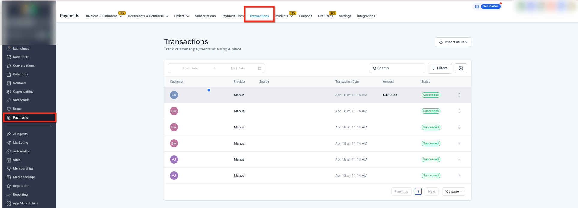This view shows completed transactions where receipt PDFs are generated automatically after successful payments.