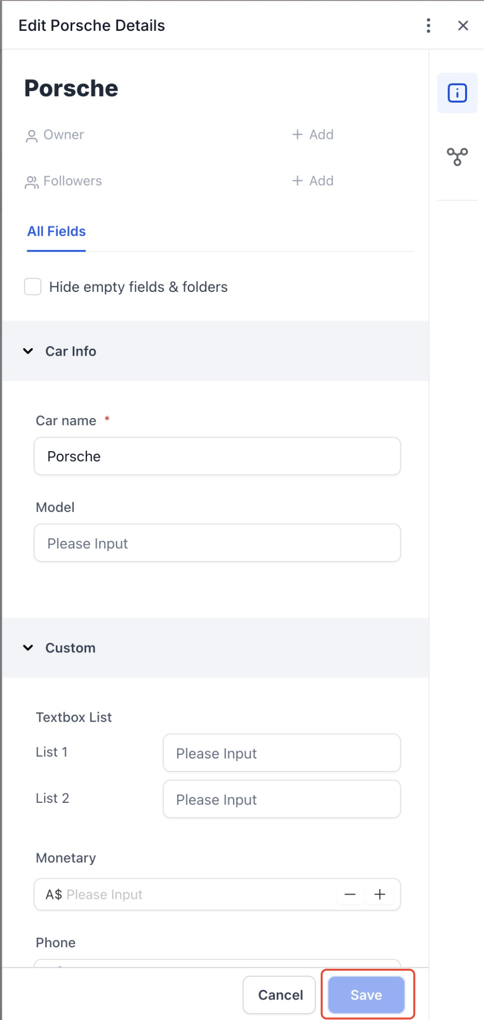 Creating a new record allows you to start tracking custom data. Only the primary field is required during creation, and additional details can be added later.