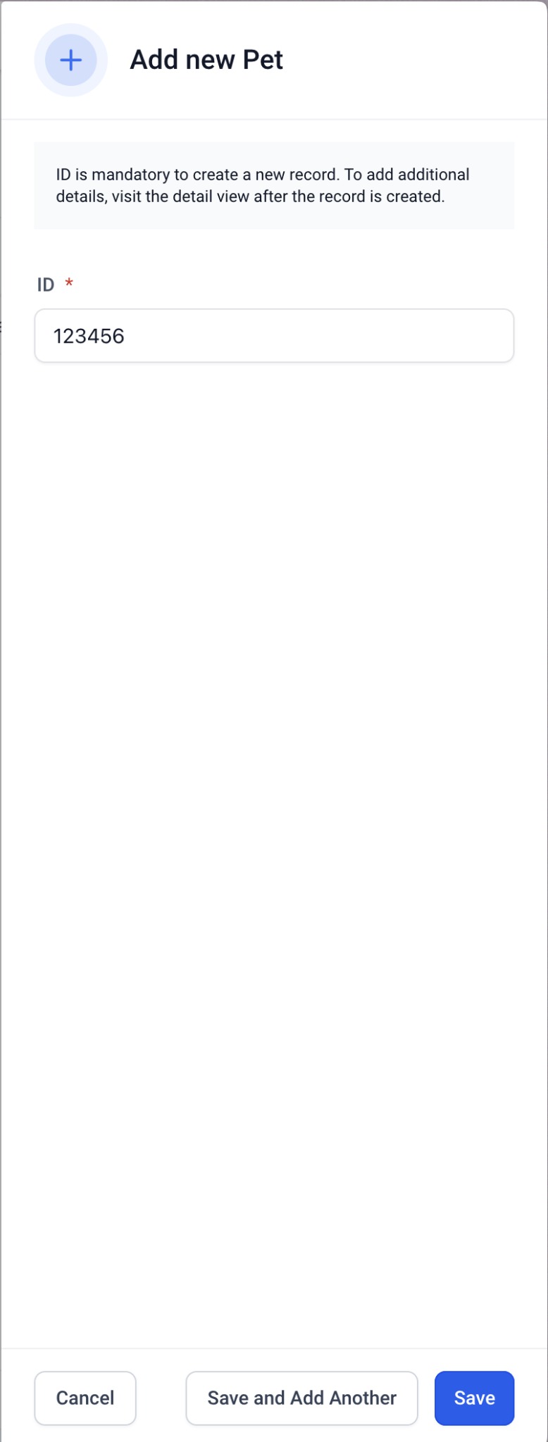Only the primary field is required at this stage. Additional fields can be updated after the record is created.