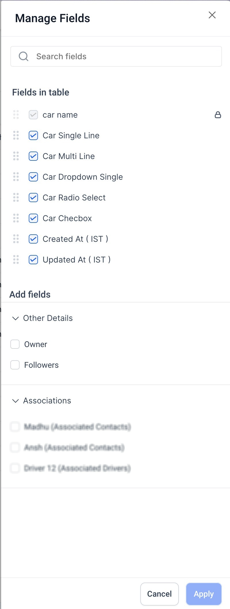 Use this panel to add, remove, reorder, or include associated fields based on your needs.