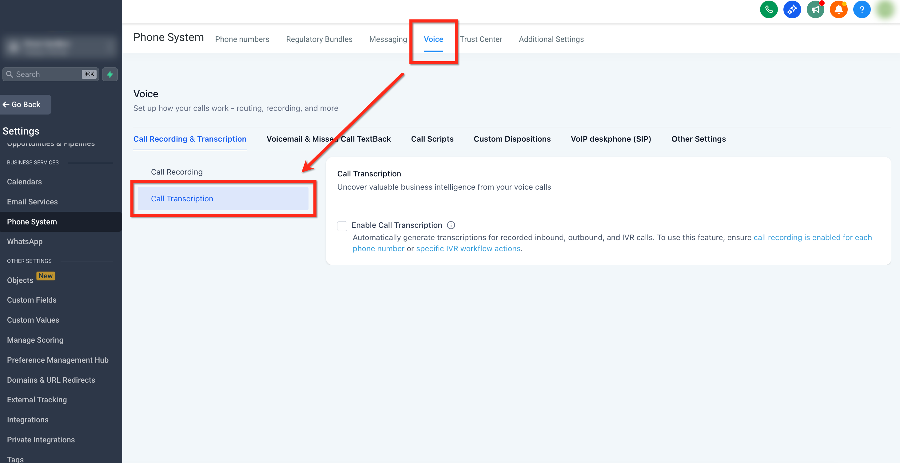 - Click on Voice tab and then on Call Transcription.
