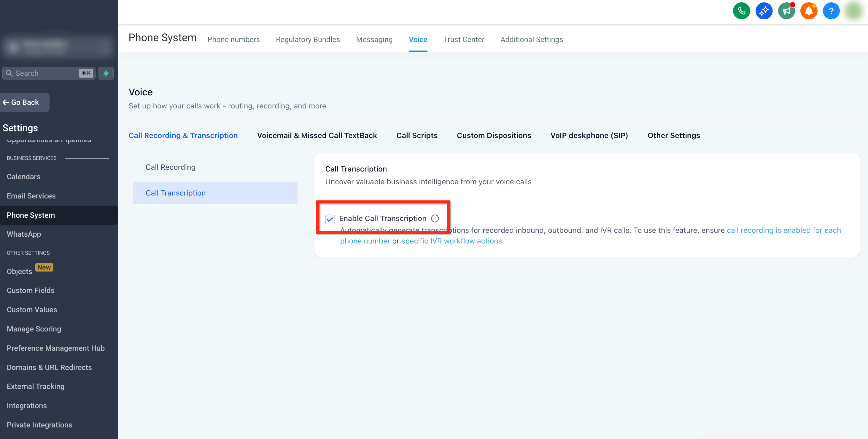 - Click on the Enable Call Transcription box to turn it on.