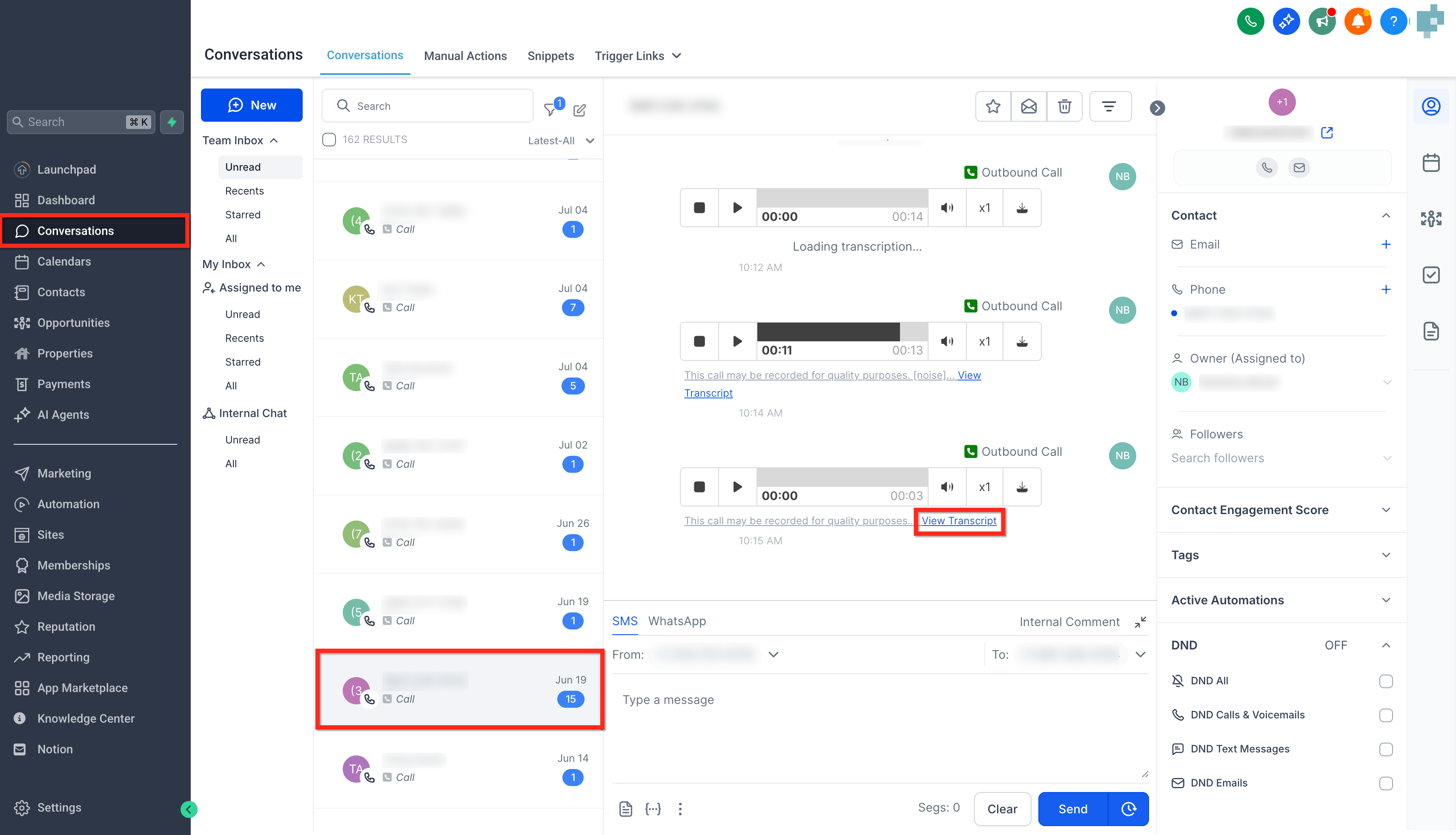 - Find the Contact that you want the transcription for.