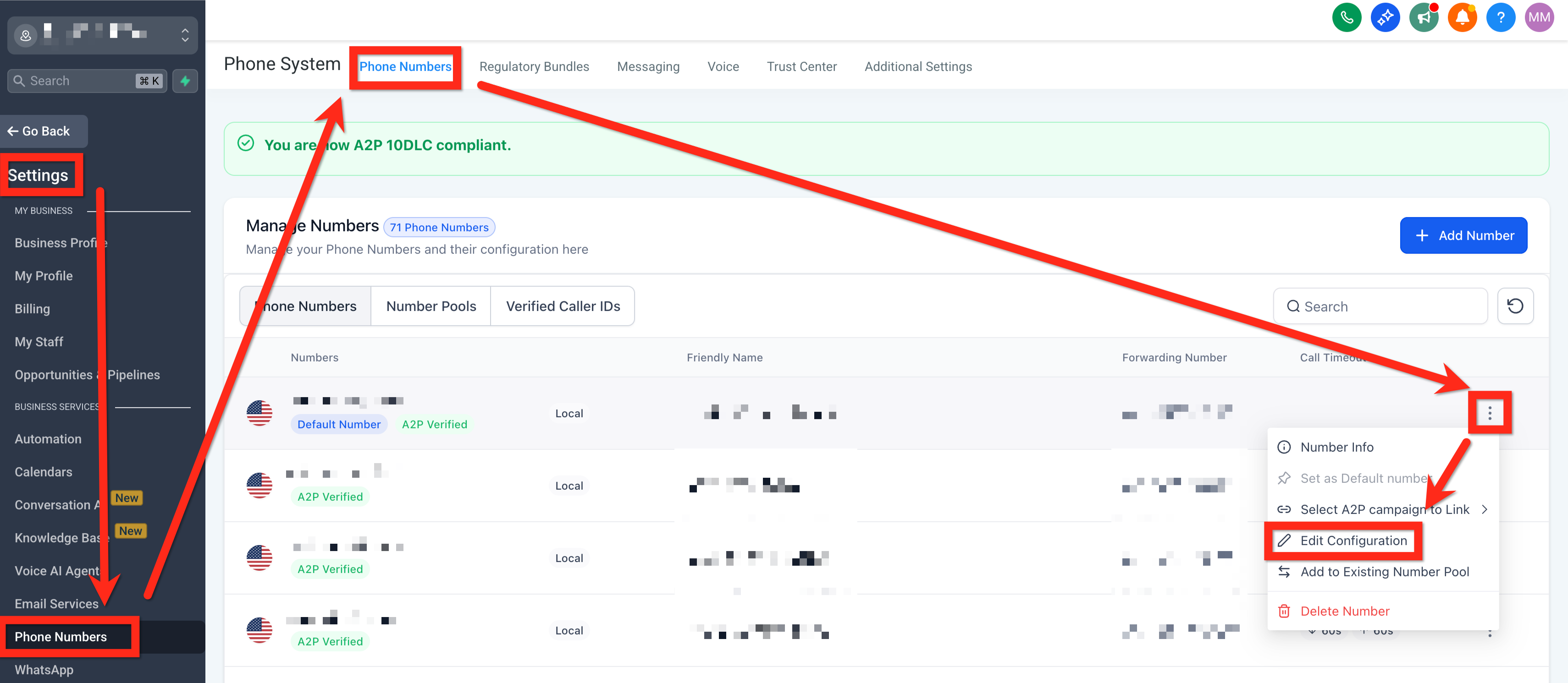 Navigate to Settings > Phone Numbers > Phone Numbers tab. On the list of phone numbers, click the 3-dot action menu next to a specific phone number, then click Edit Configuration.