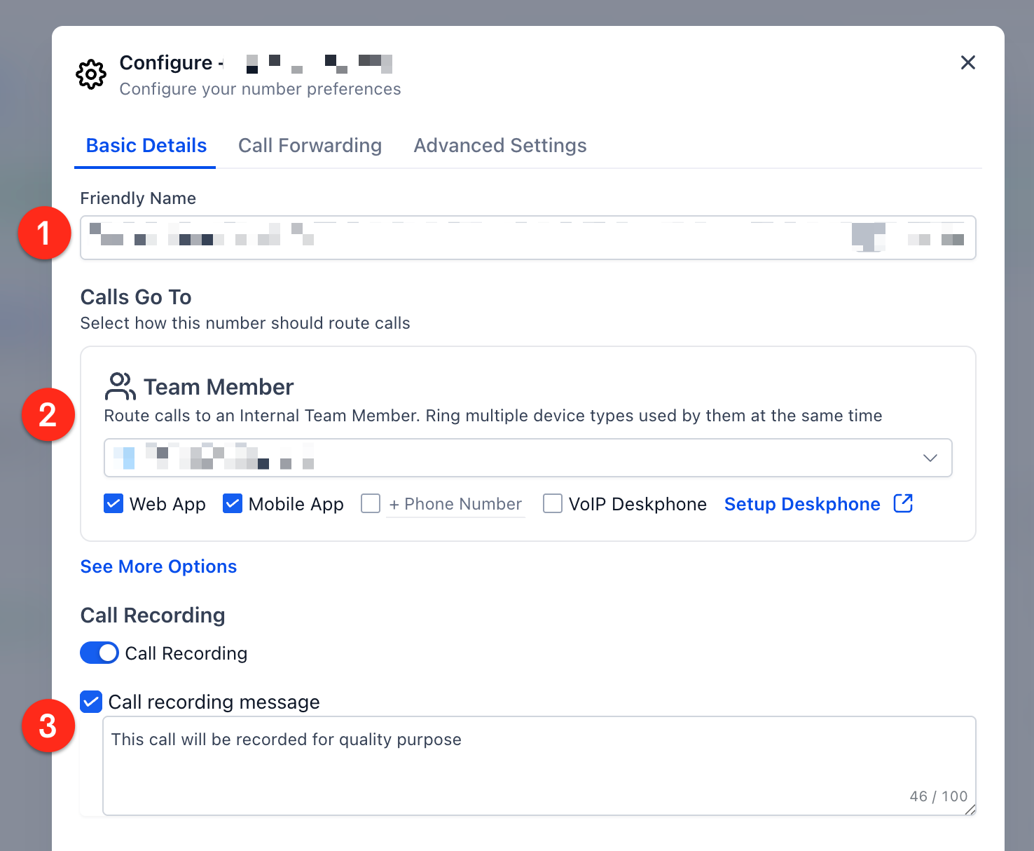 A: Yes—click the deep-link next to “Forwarding Number” or open the full Edit Configuration page for the number.