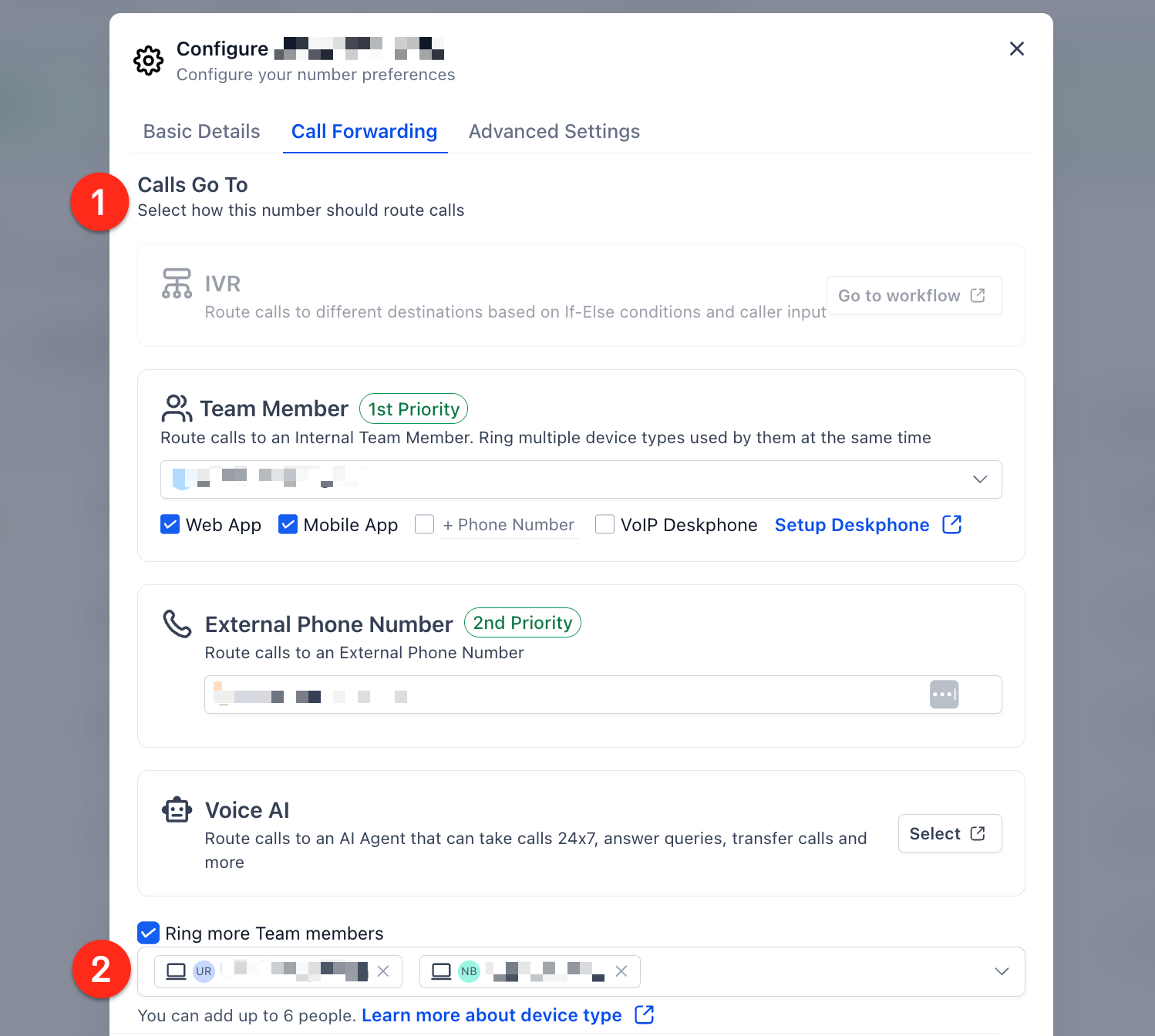 - IVR - If IVR manages the number then none of the other options will be enabled. Go to the IVR settings to manage the number.