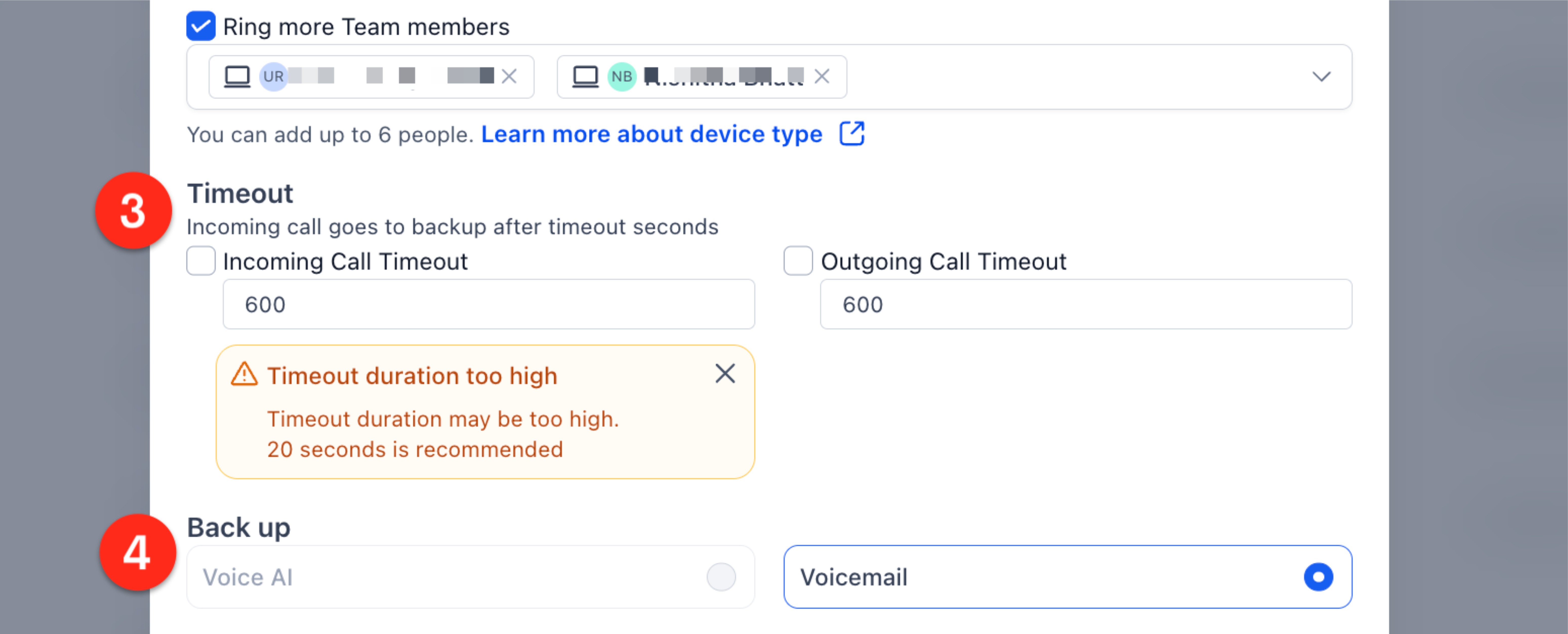 - Timeout - Incoming calls go to the Backup after the set number of seconds.