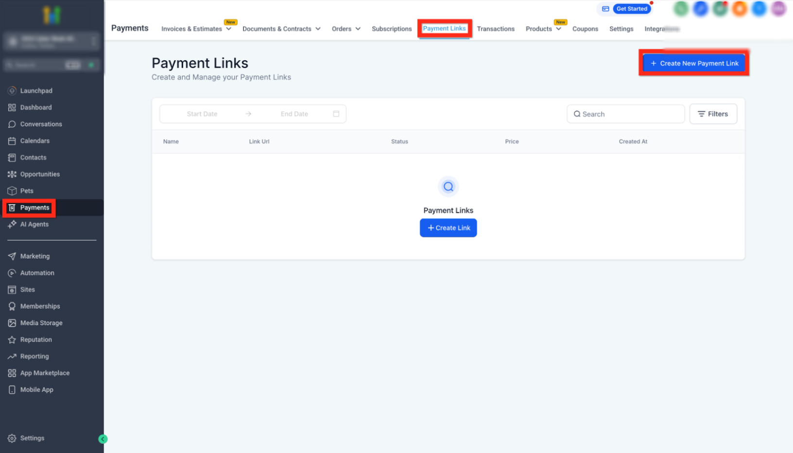 Navigate to the Payments section from the left-hand menu, then click on Payment Links in the top navigation.
