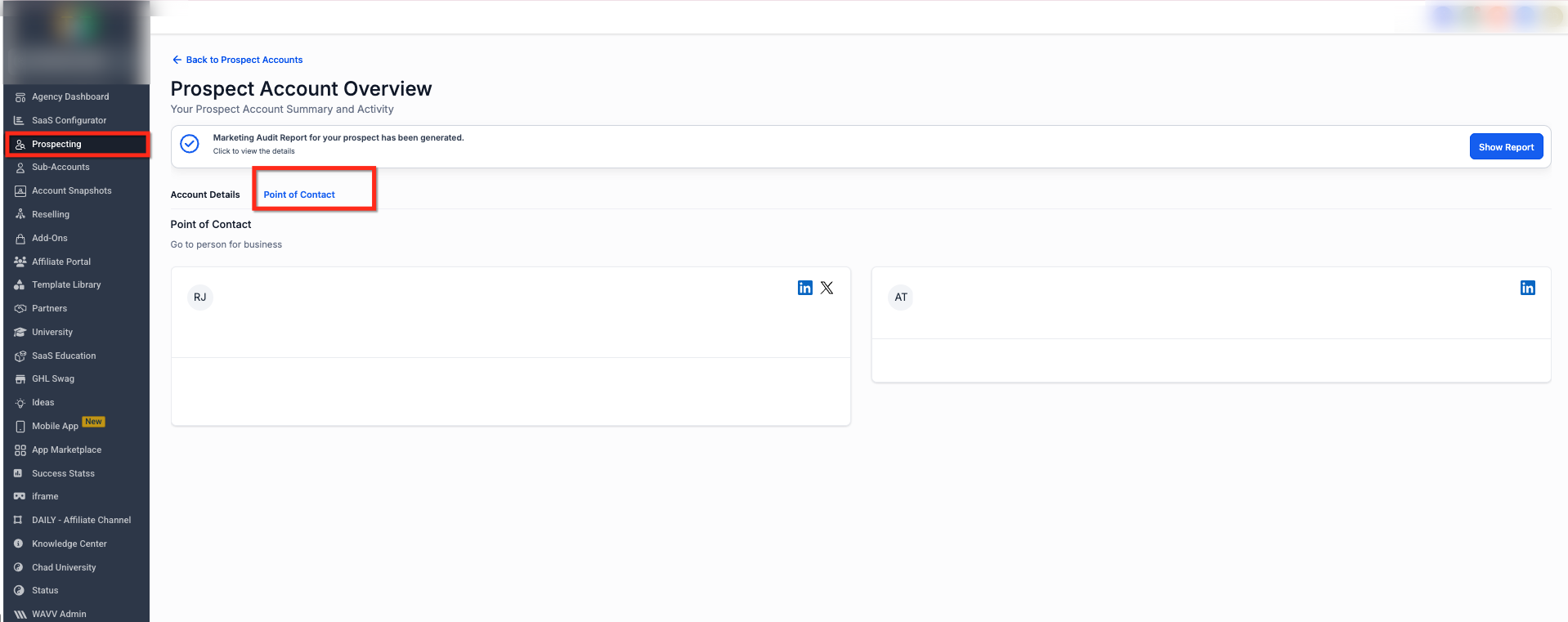 The Points of Contact tab is a dedicated view inside a prospect account that displays the most relevant people associated with that business. Instead of relying on a single generic contact, you can review individuals, understand their role, and choose the best outreach approach.