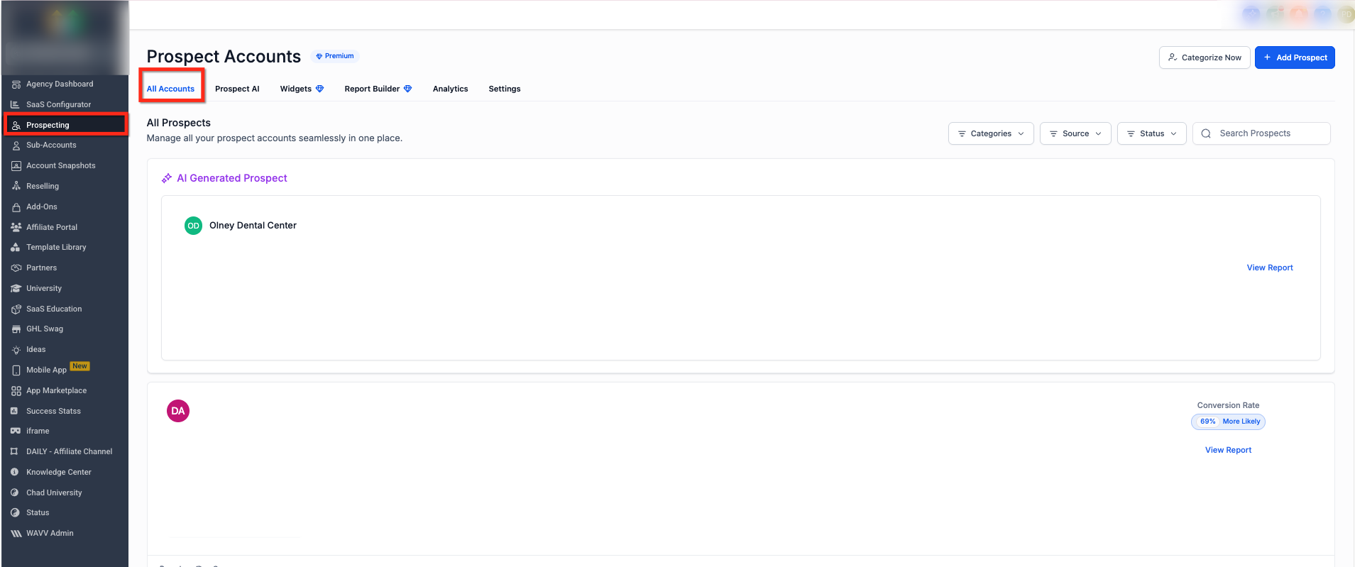 Confirm you are viewing a saved prospect account, not a preview screen.