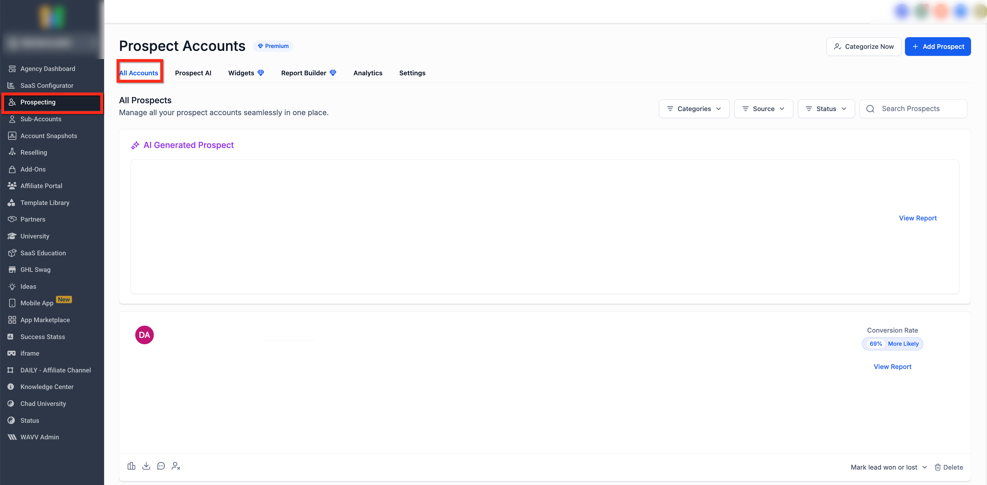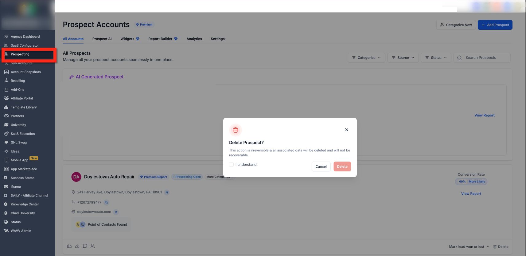 Deleting a prospect permanently removes that prospect from your prospect list and deletes associated data connected to that prospect entry. This action cannot be undone.
