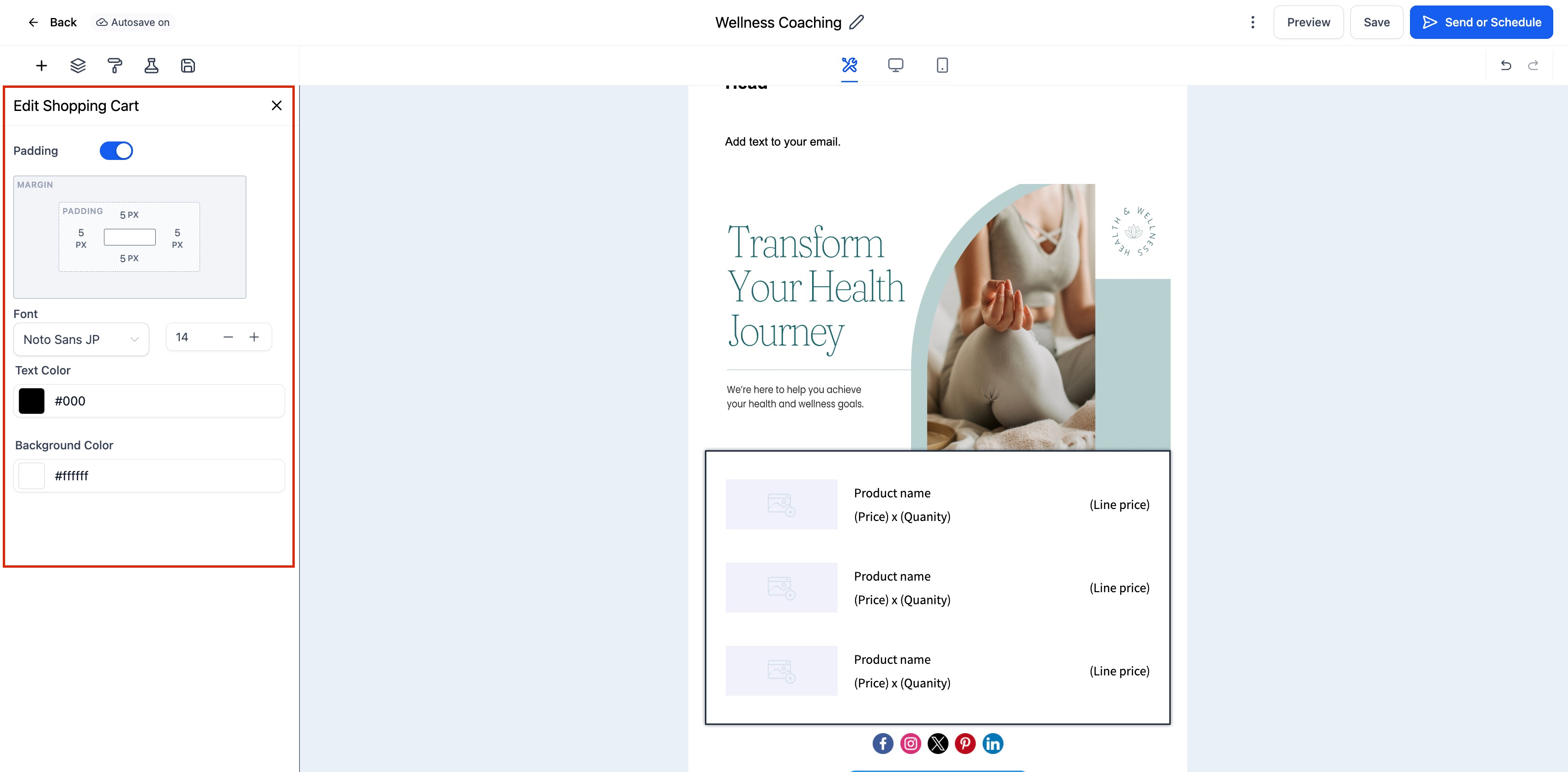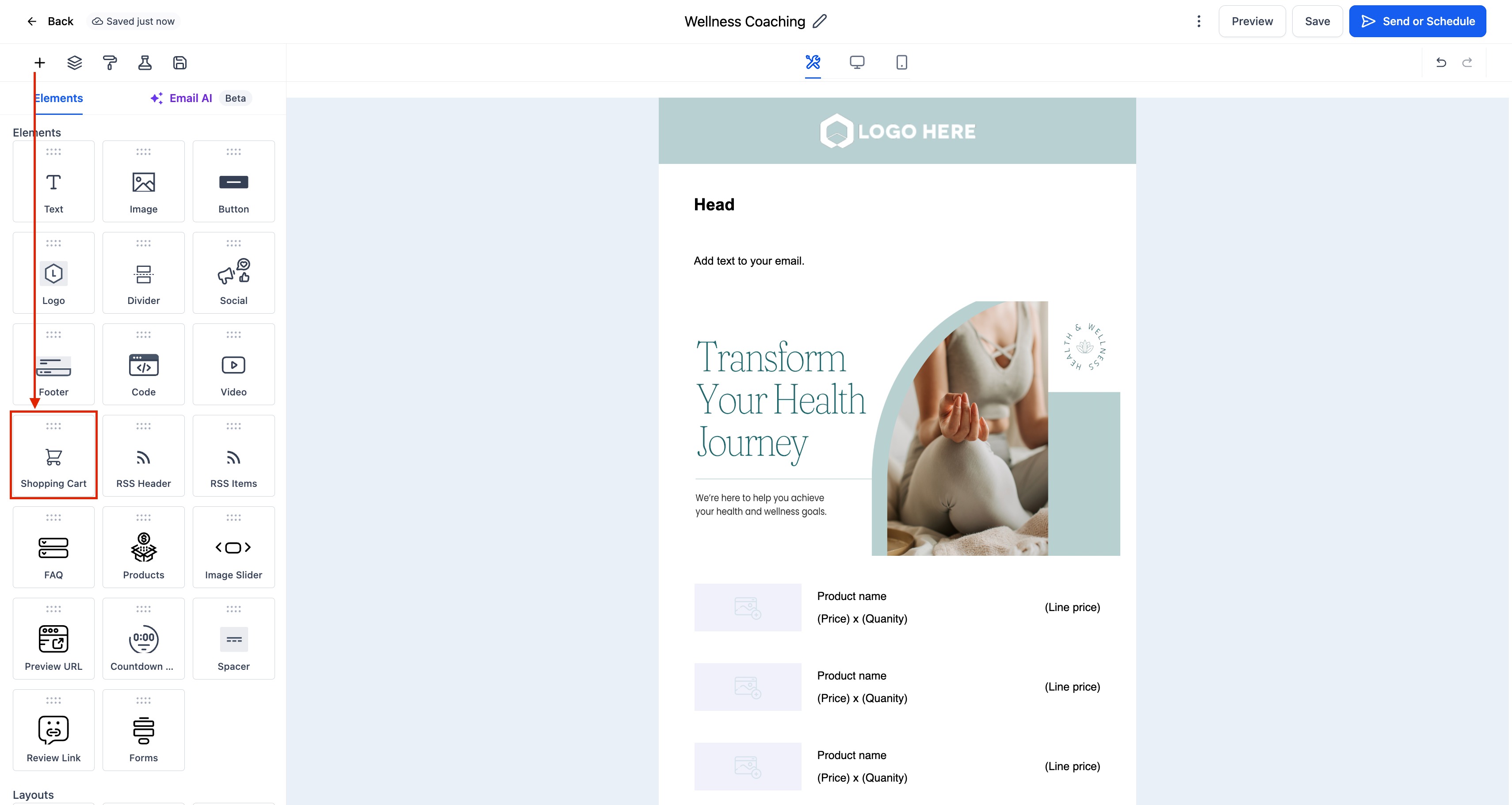 Drag and drop the Shopping Cart Element into your desired section of the email layout.