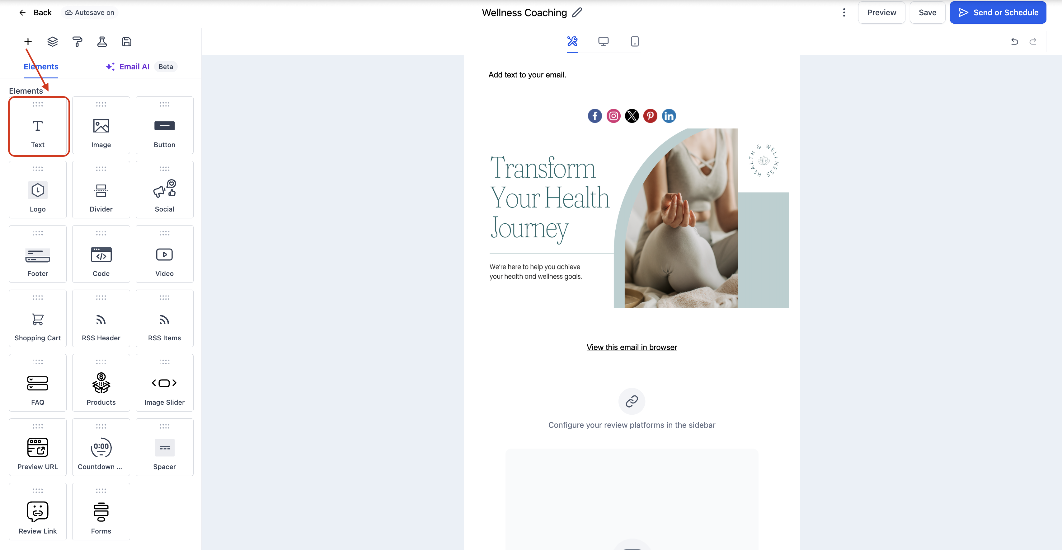 In the Email Builder, click the Add Elements (+) icon on the left sidebar.