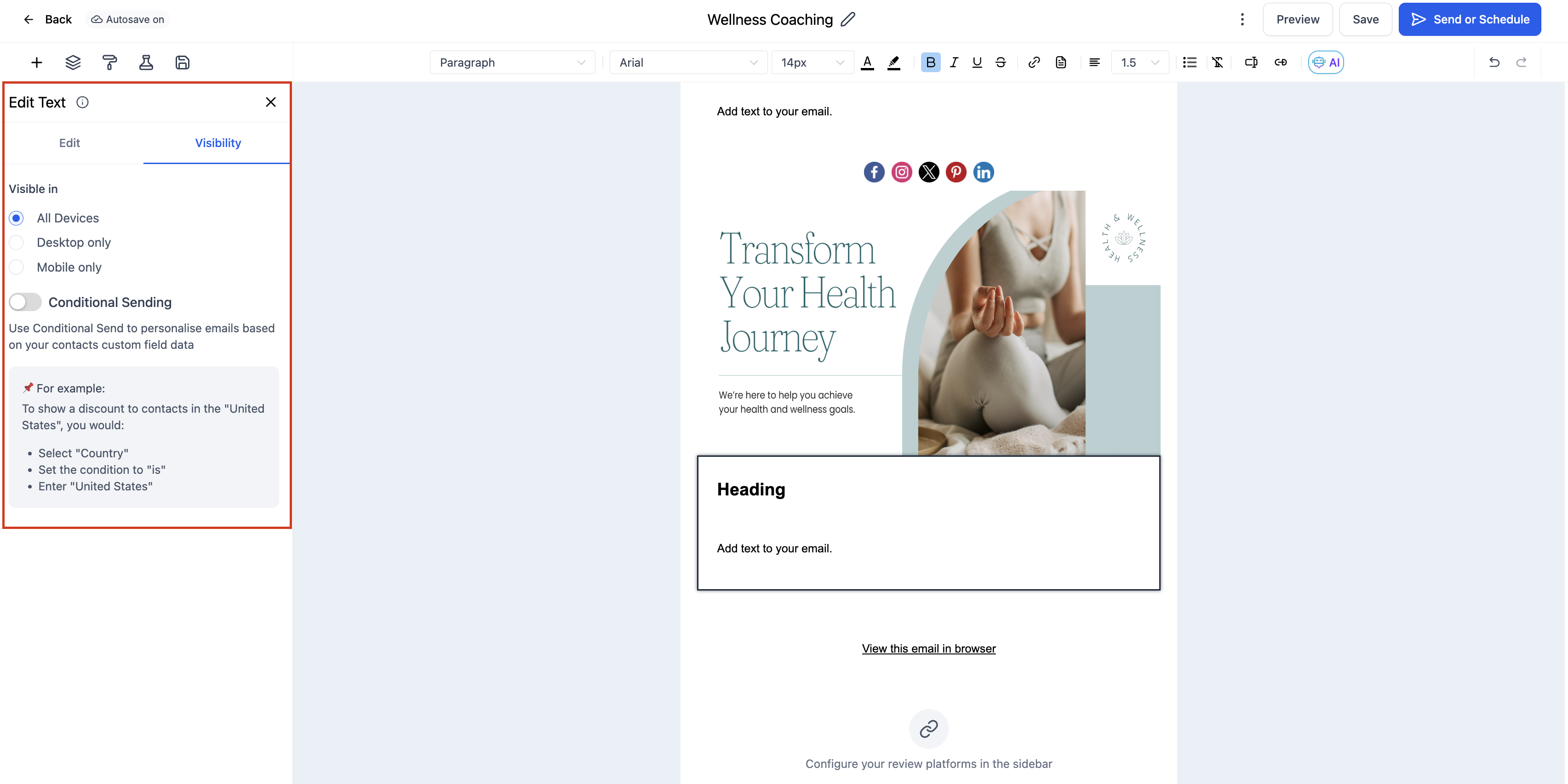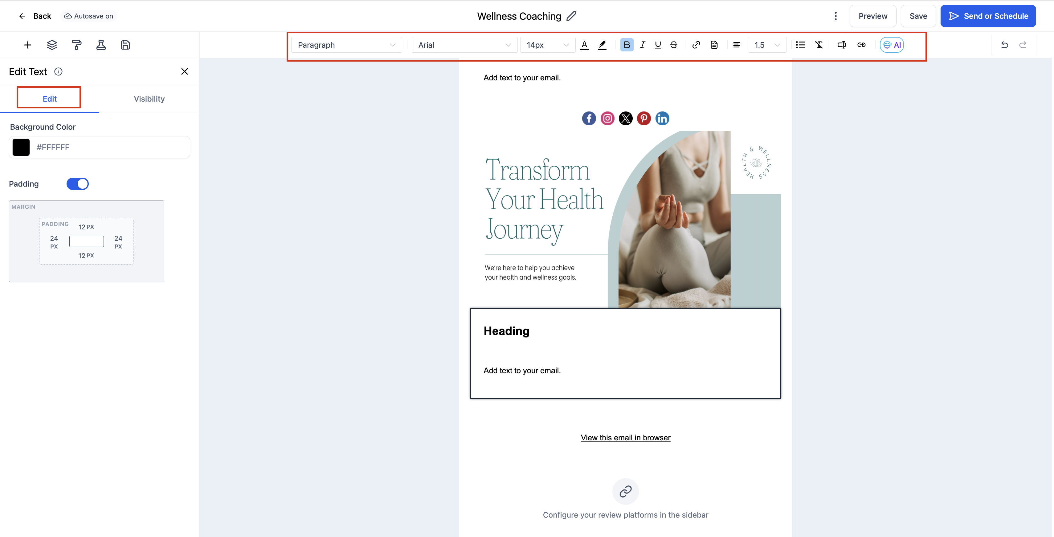 The Text Element in s Email Builder allows you to easily add and style written content such as headings, paragraphs. It provides flexible formatting options, helping you create visually appealing and readable email designs that align with your brand’s tone and message.