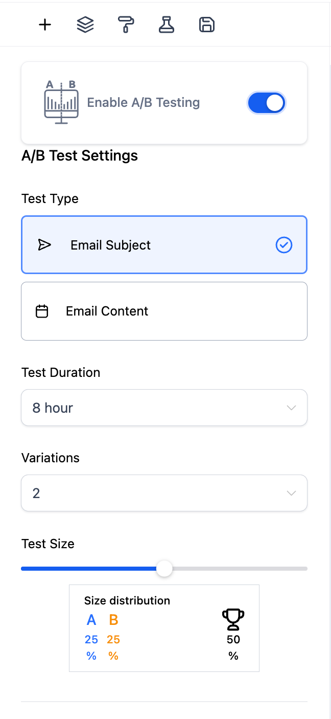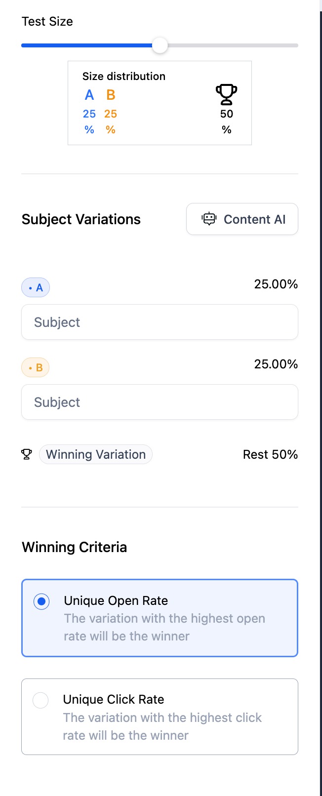 Example: If you test two variations (A and B), you might send each to 25% of your audience and reserve the remaining 50% for the winning version.