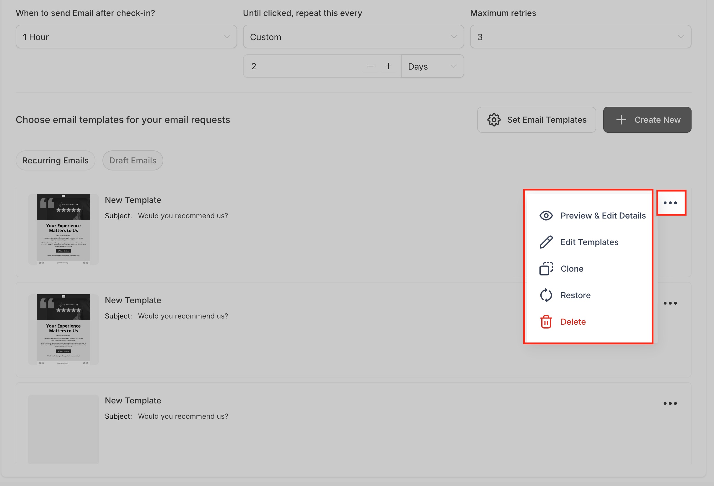 Once your templates are saved, you’ll find them listed in the Email Requests dashboard. Next to each template, click the three dots (⋮) to open management options: