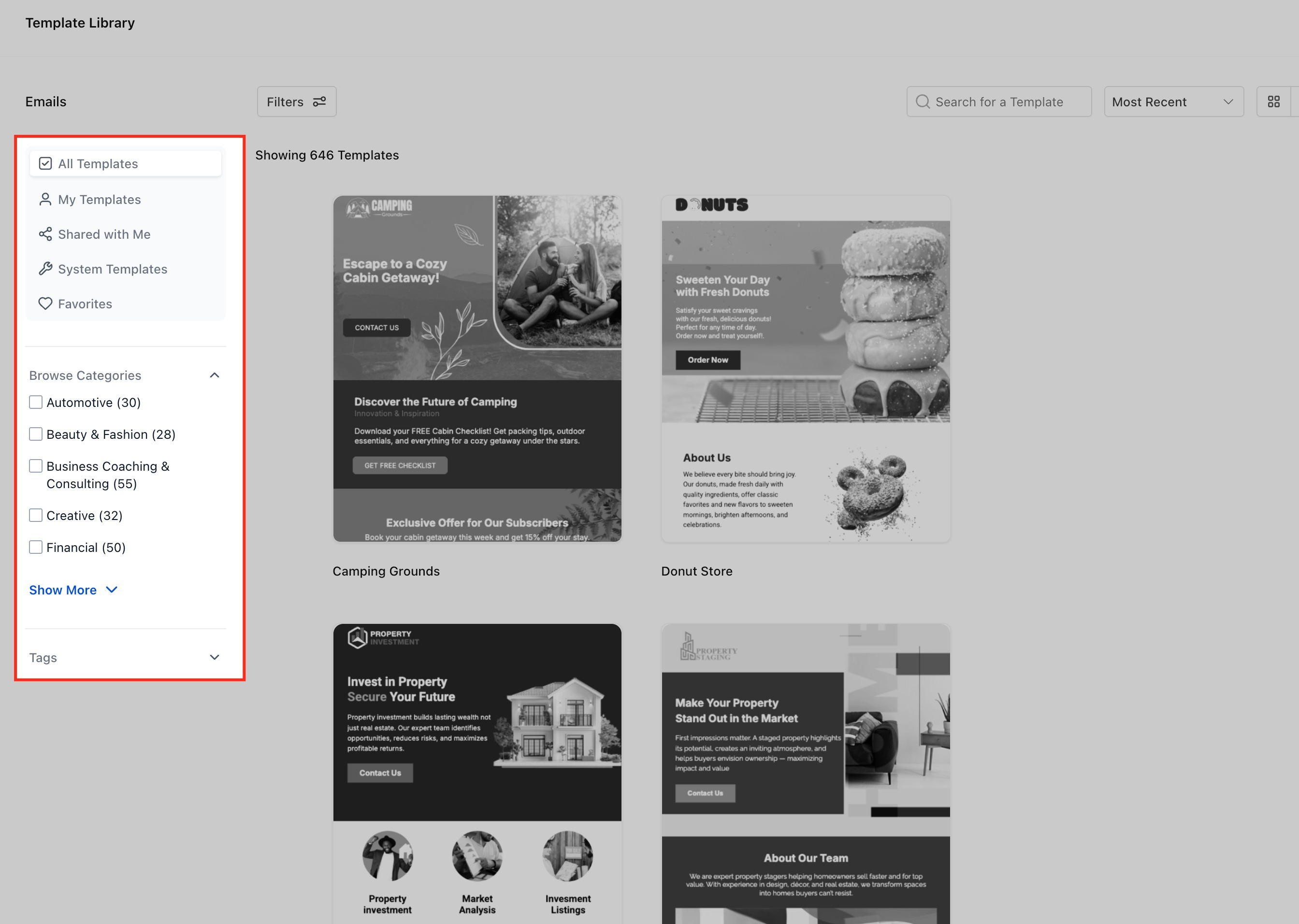 If you prefer a faster route, select Template Library. You’ll see a collection of professionally designed templates, organized by categories such as Business Coaching, Financial, Creative, and more.