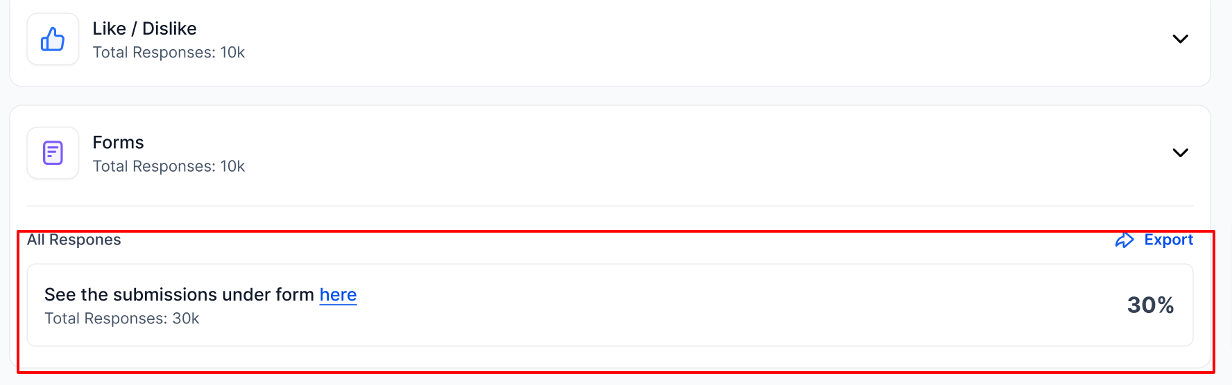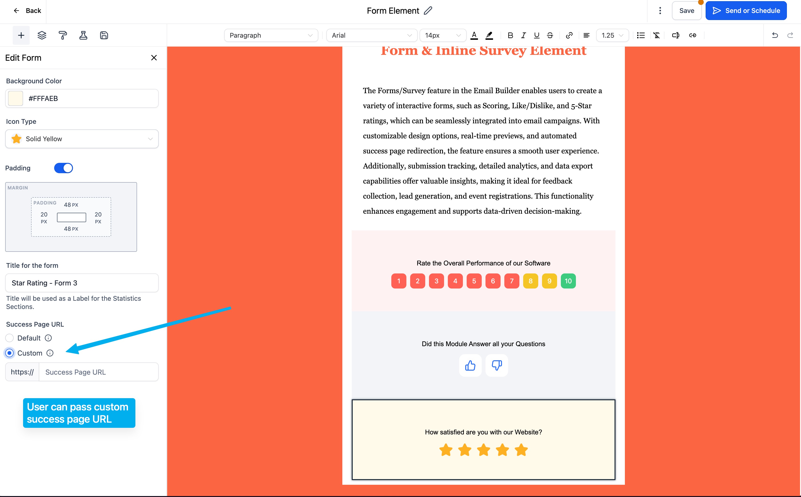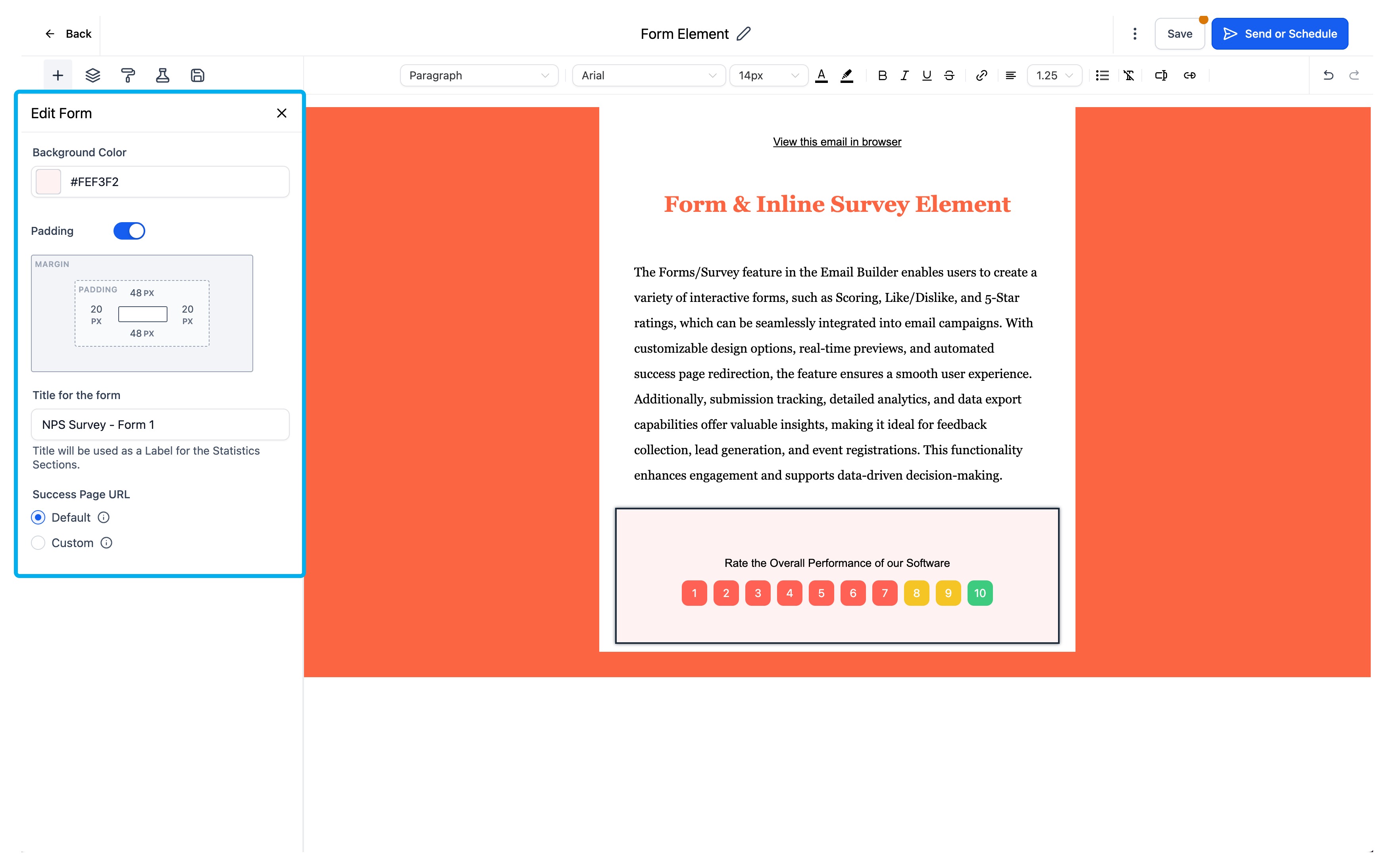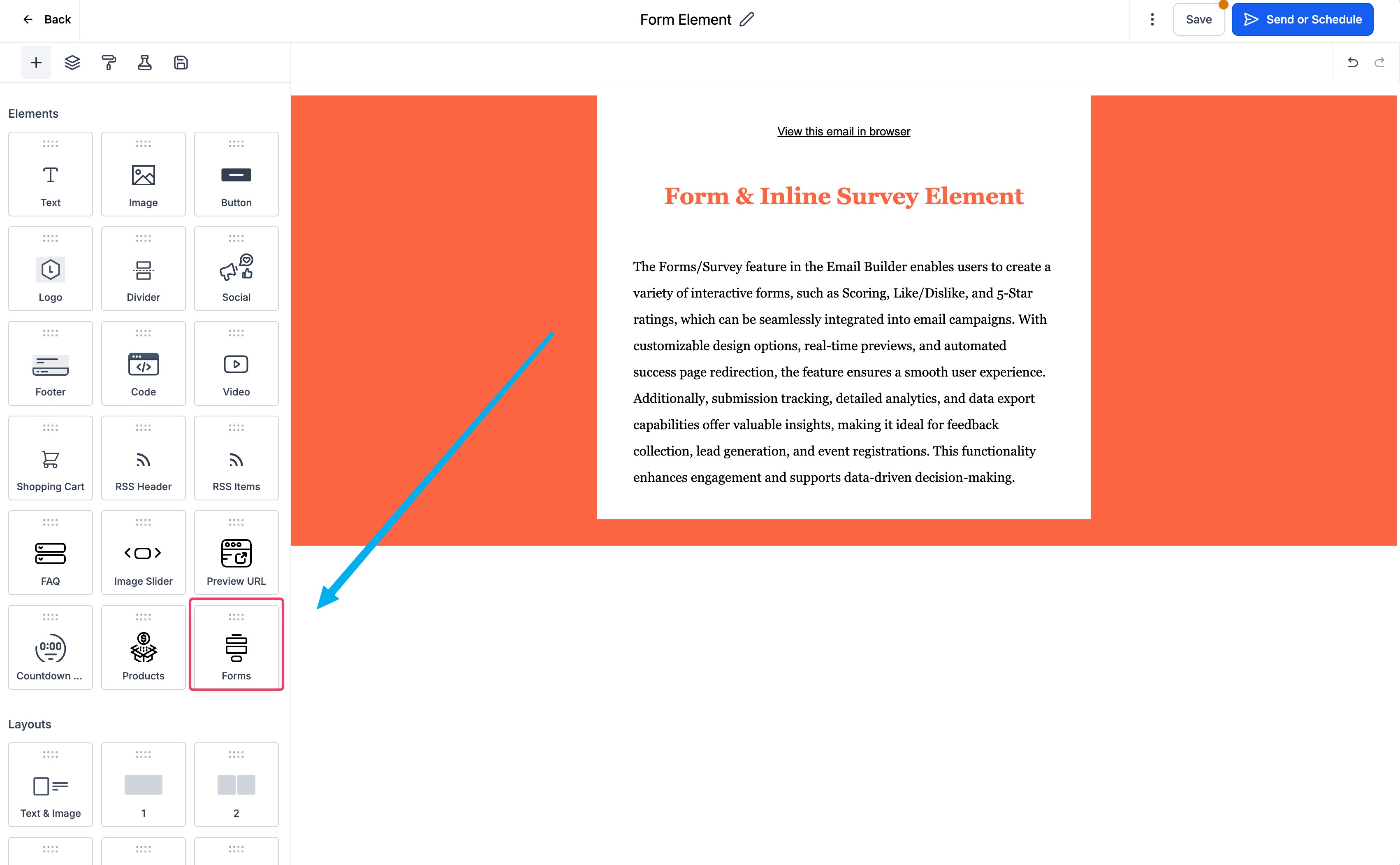 The Forms/ Surveys Element allows you to add pre-built or custom feedback forms (1-10 scoring, like/dislike, 5 stars, etc.). It helps collect and analyze responses via the Submissions tab under campaign statistics.