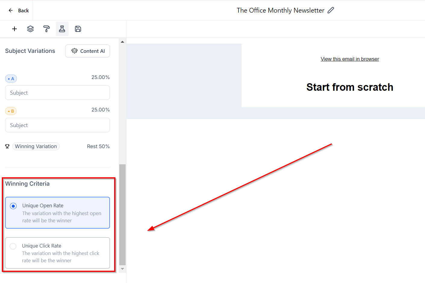 Select which winning metric you want to measure: Unique Open Rate or Unique Click Rate.