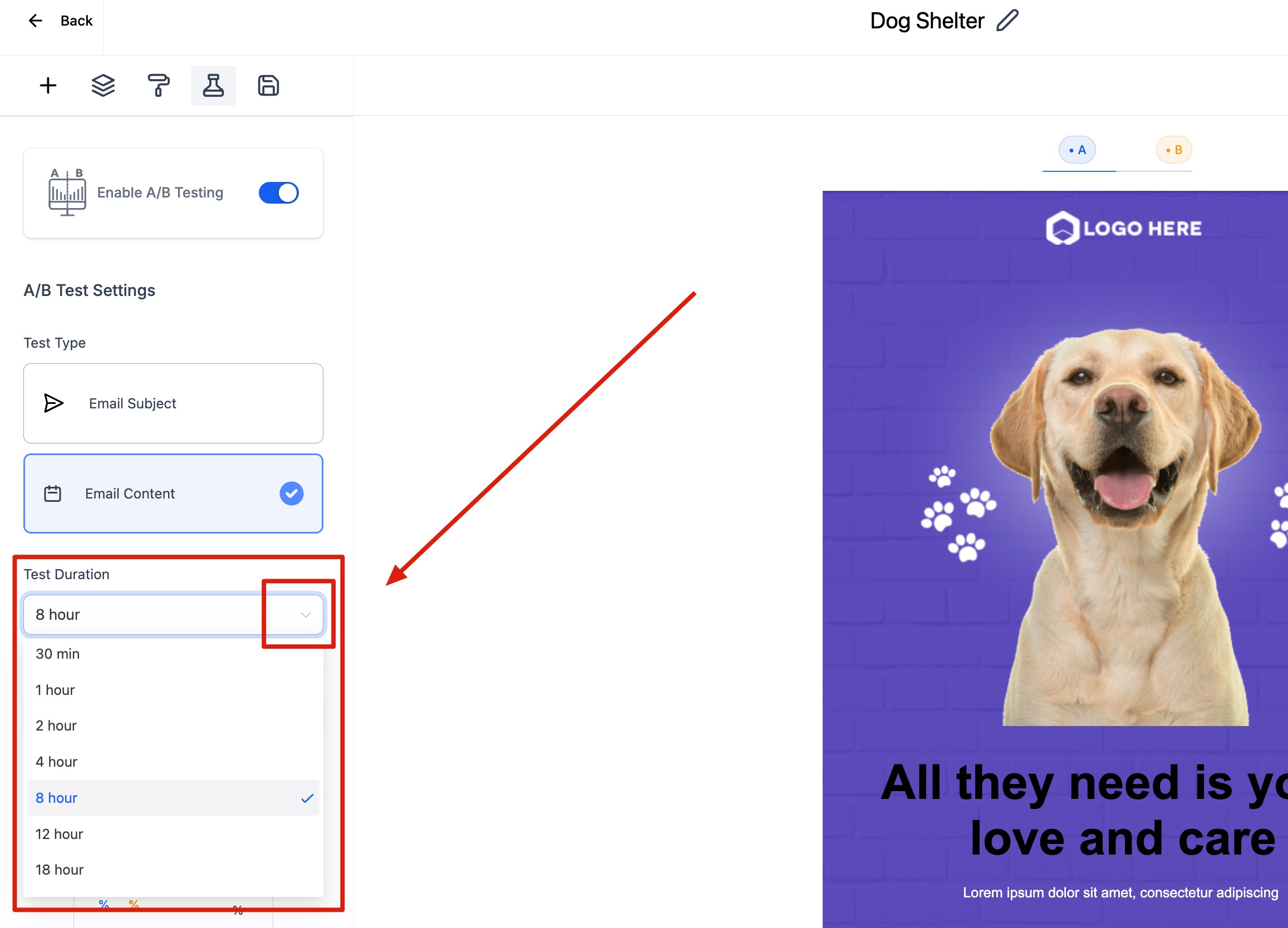 Step 1: Go to Marketing > Emails > Select "Campaign" from the dropdown. After creating a new Email Campaign, there is an option to enable "A/B Testing."