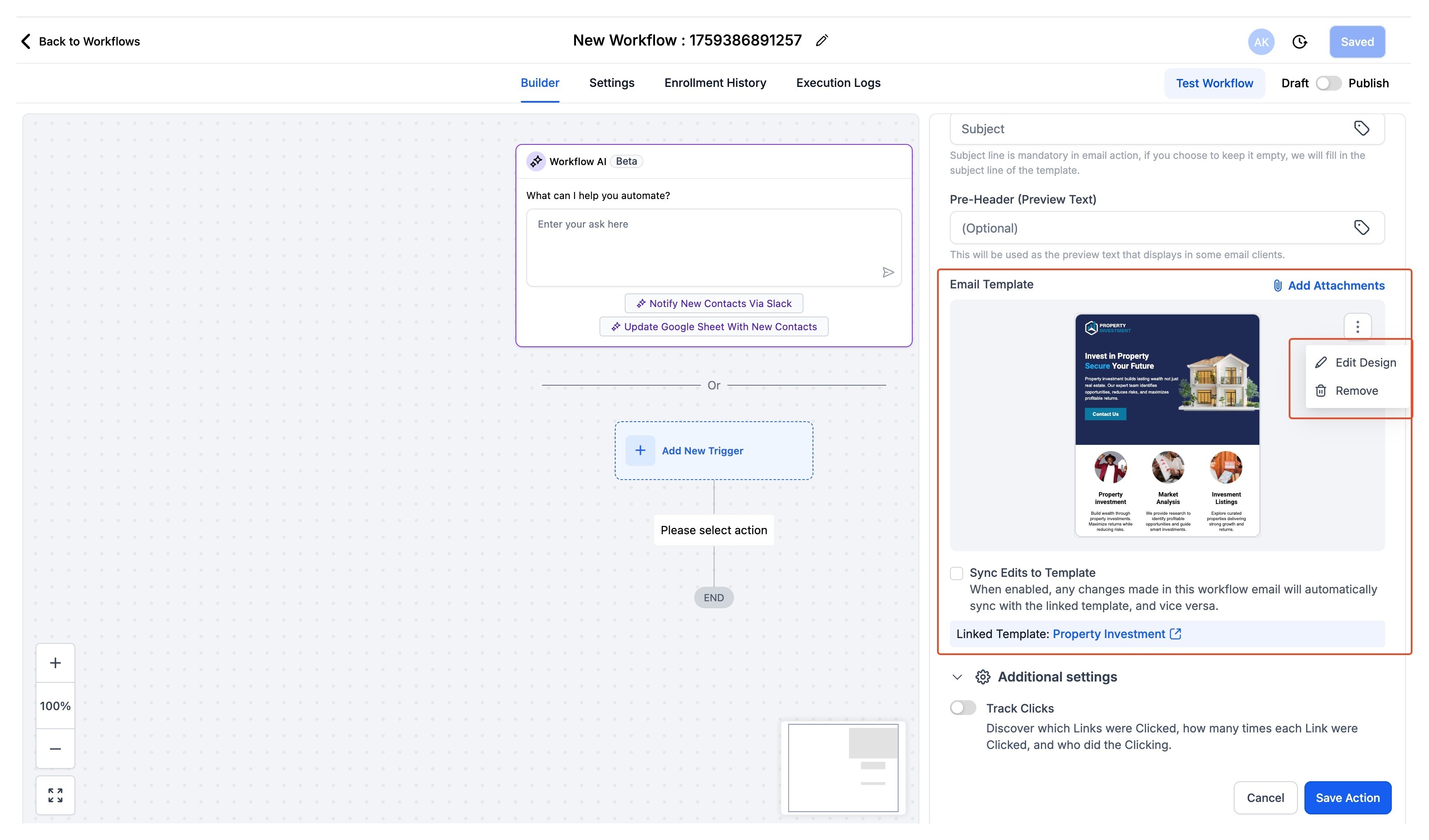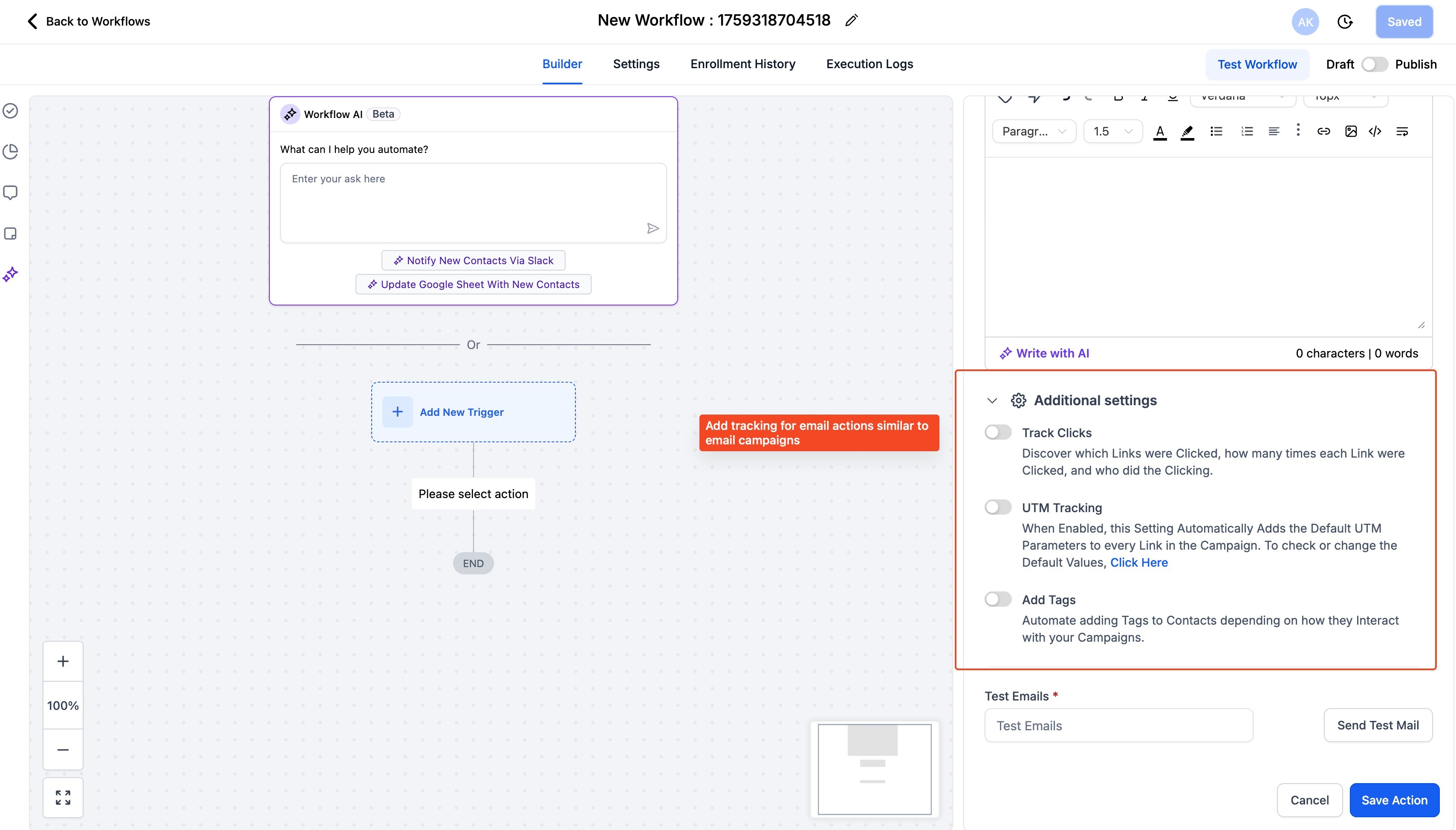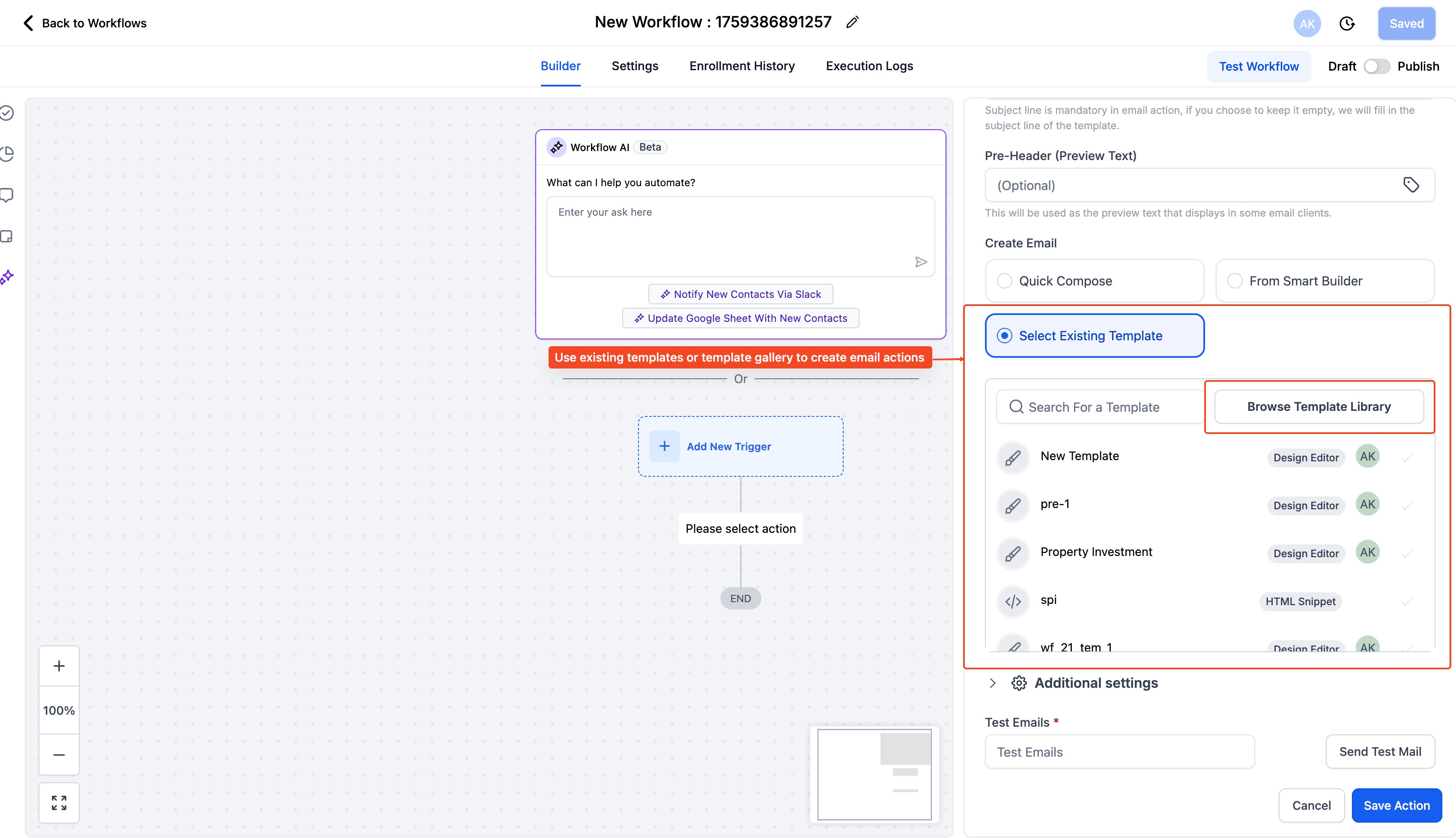 The Email Action in Workflows now features a unified, intuitive UI, making the email creation process consistent and streamlined across Campaigns, Bulk Actions, and Workflows.
