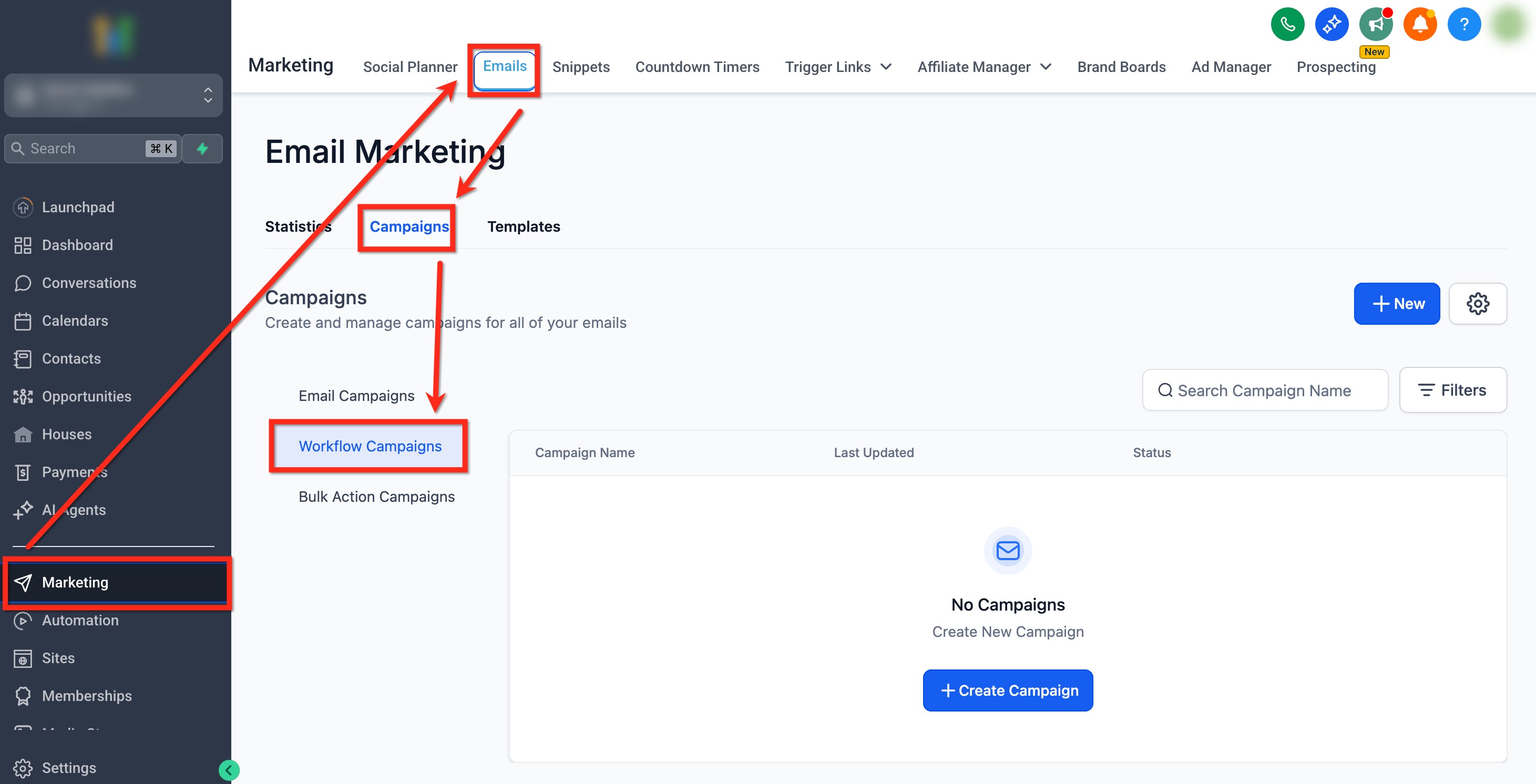 - Go to Marketing → Emails → Campaigns → Workflow campaigns