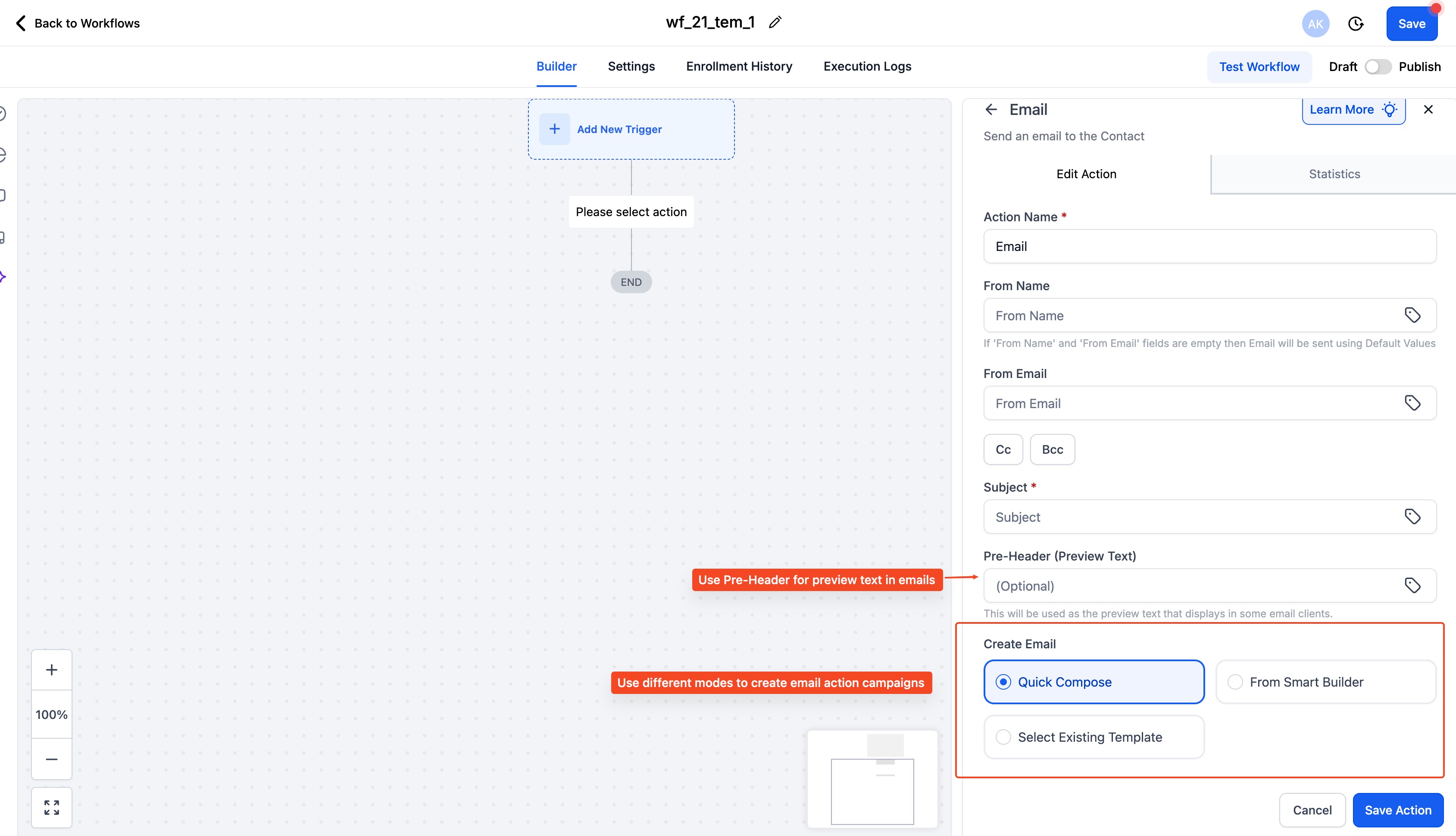 The Email Action (New UI) is a redesigned experience for creating and managing emails sent from Automations → Workflows. It aligns the workflow email composer with Email Builder and Campaigns so you get the same starting options, editing tools, advanced settings, and statistics everywhere.