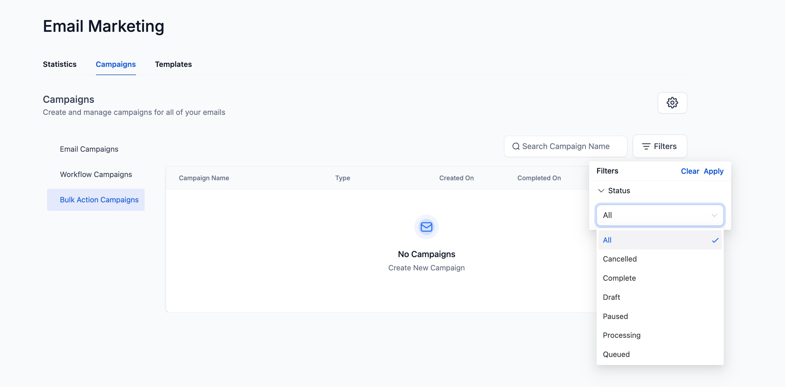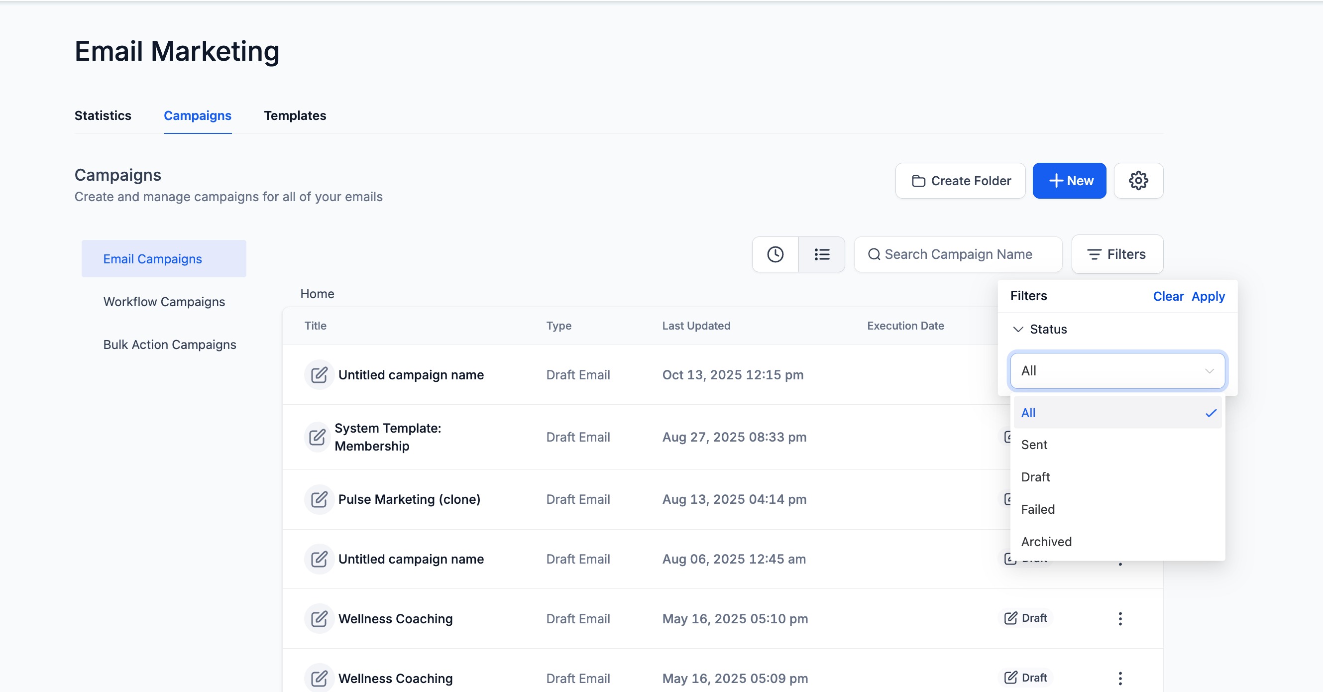 Each campaign type Email Campaigns, Workflow Campaigns, and Bulk Action Campaigns includes specific status indicators to help you quickly identify whether a campaign is a draft, active, sent, or completed.